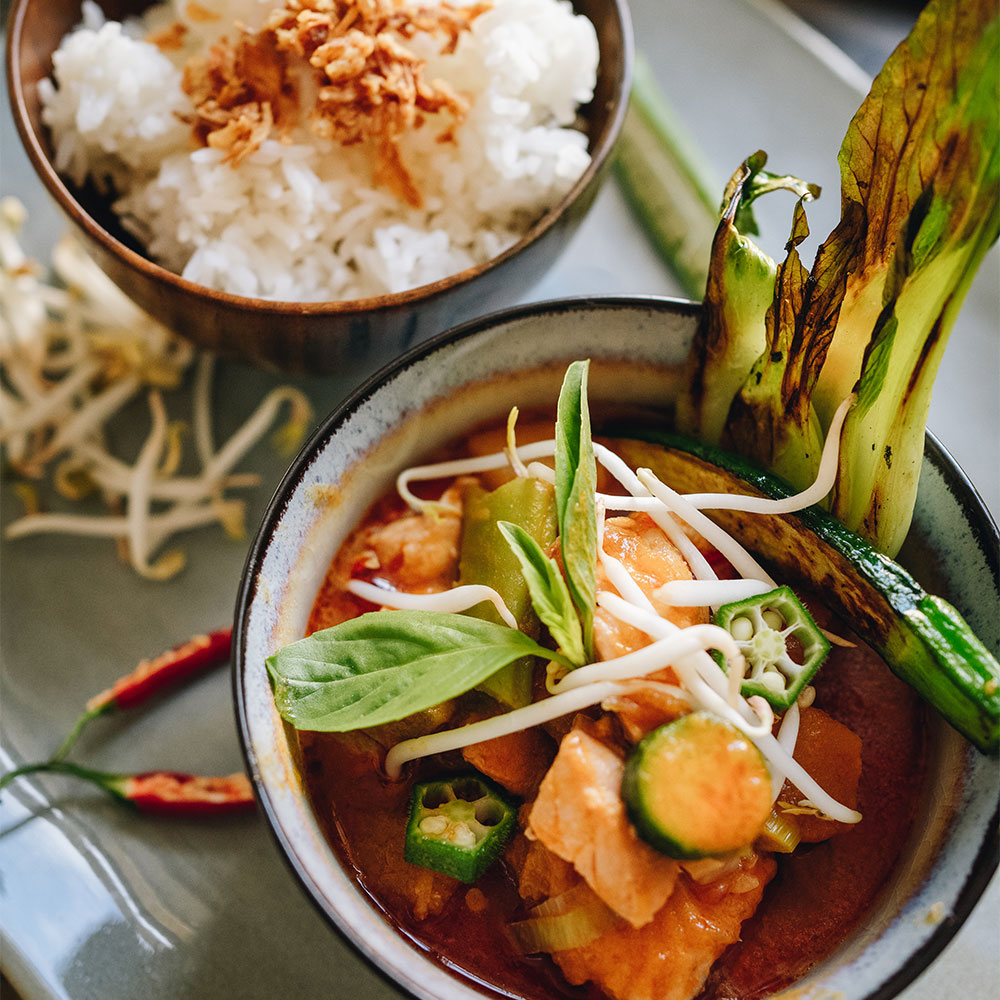 - Na velké wok pánvi si rozehřejeme olej a osmažíme nejprve šalotku, poté přidáme mrkev, šarlatové fazole, cuketu, okru a předvařenou dýni, velice zprudka vše restujeme, poté přidáme dvě červené kari pasty a mícháme. Jakmile se začne pasta lehce přilepovat na pánev, přidáme na kostky nakrájeného lososa a hned poté nalijeme do pánve kokosové mléko. Vše důkladně promícháme.