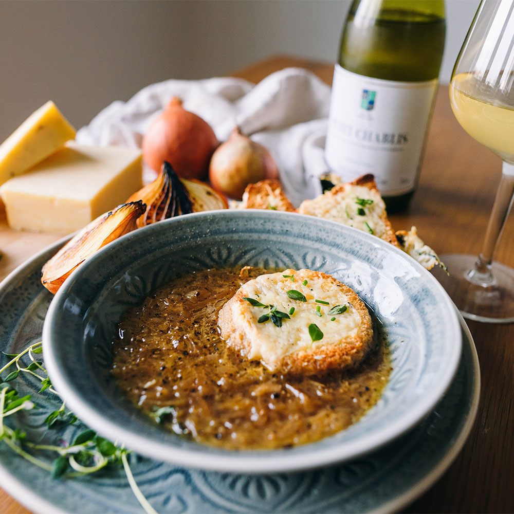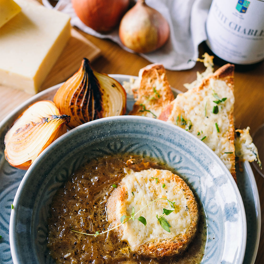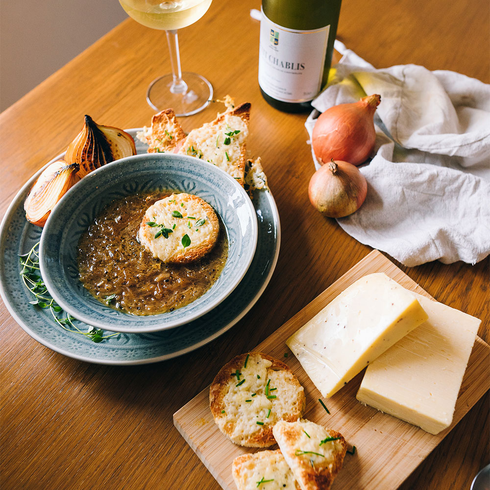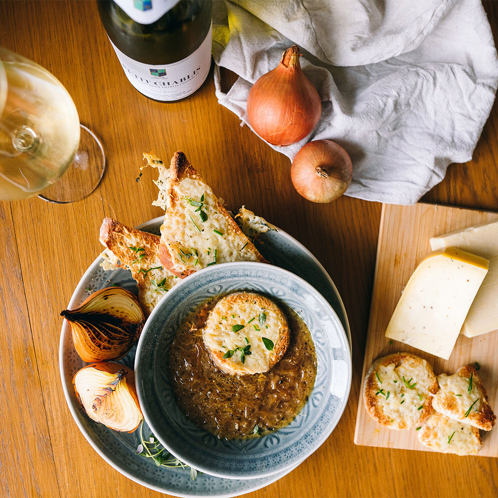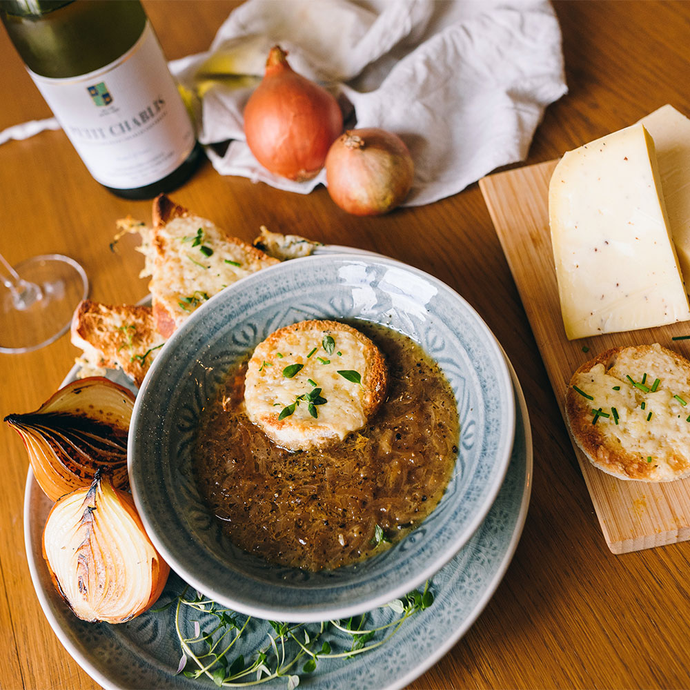 - Wine pairing: Petit Chablis, Appelation Petit Chablis Contrólée, Bourgogne, Francie, 2017. Nezapomeňte si k naší polévce otevřít láhev minerálního Petit Chablis, které bylo vyrobeno z hroznů Chardonnay z regionu Bourgogne ve Francii, kde má svoje nejlepší podmínky pro pěstování. Toto lehké víno příjemně doplní chuť cibulačky.