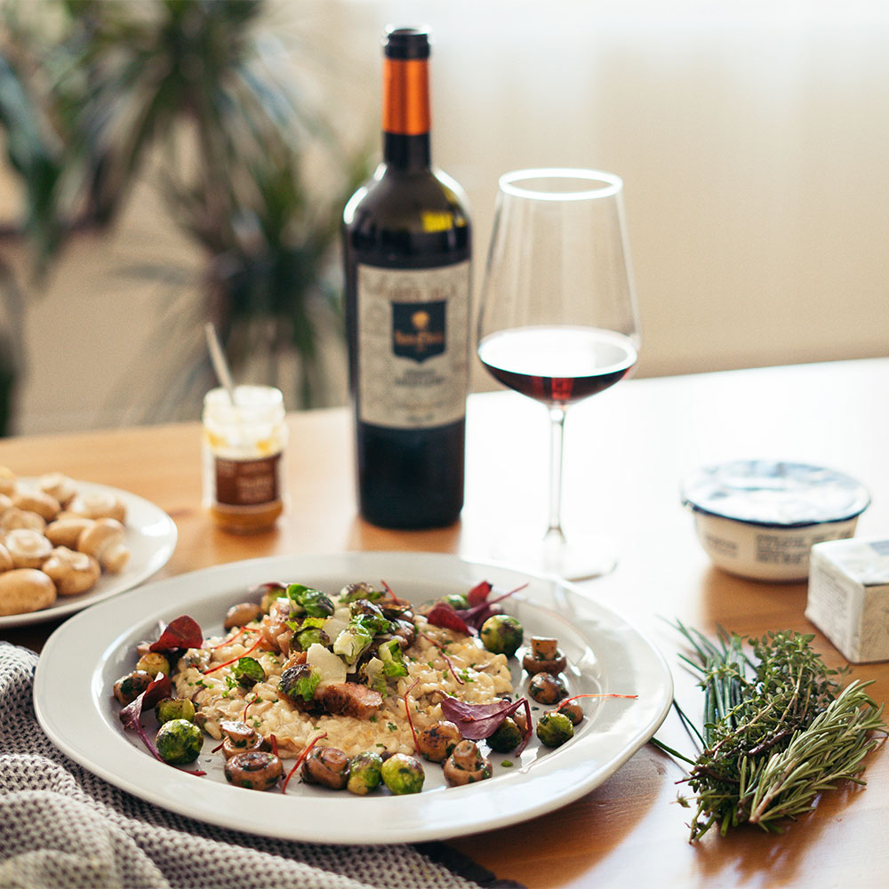 Risotto a houby jdou vždycky k sobě. Pravé krémové risotto je jeden z receptů, který mě vždy dobře zasytí a zahřeje. Ovšem tento recept je vylepšený a je více víkendový a sváteční. Přidáním telecího steaku a restovaných kapustiček společně s hříbky dodáme risottu charakter bohaté chuti. K tomuto receptu jsem pro Vás vybral velice oblíbené sicilské červené víno Nero d’Avola, které je plné a robustní a hezky se doplňuje s krémovým risottem a telecím steakem.