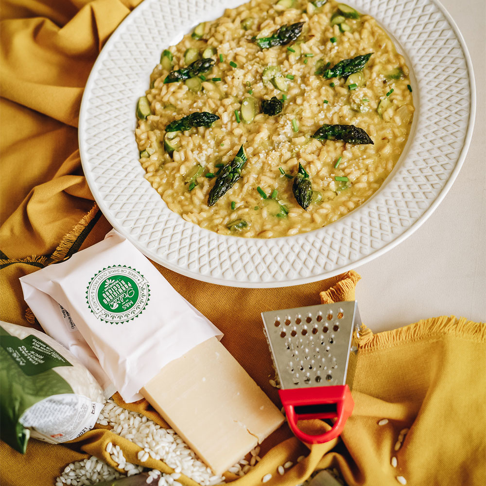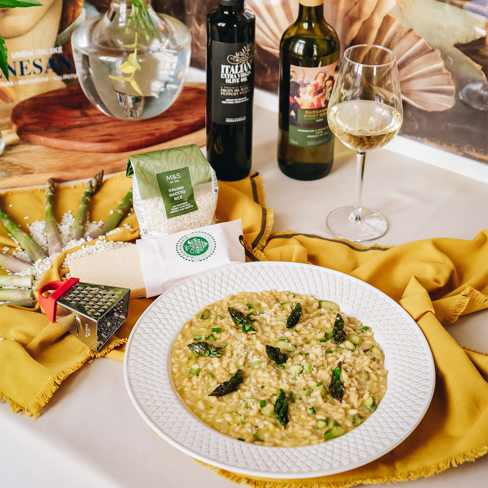 - Risotto servírujeme na teplé, plytké talíře společně s restovanými špičkami chřestu a najemno nakrájenou pažitkou.
