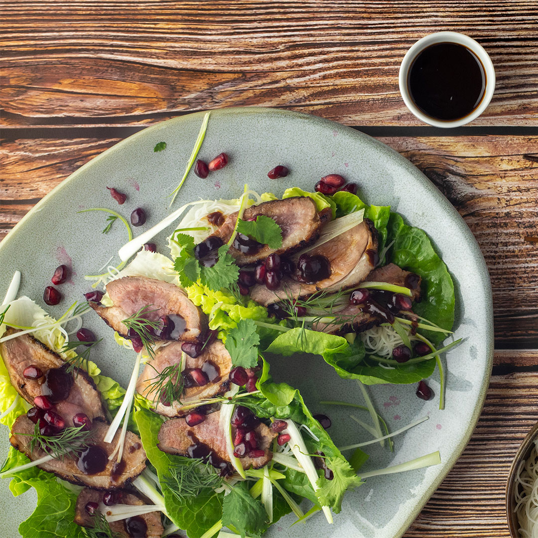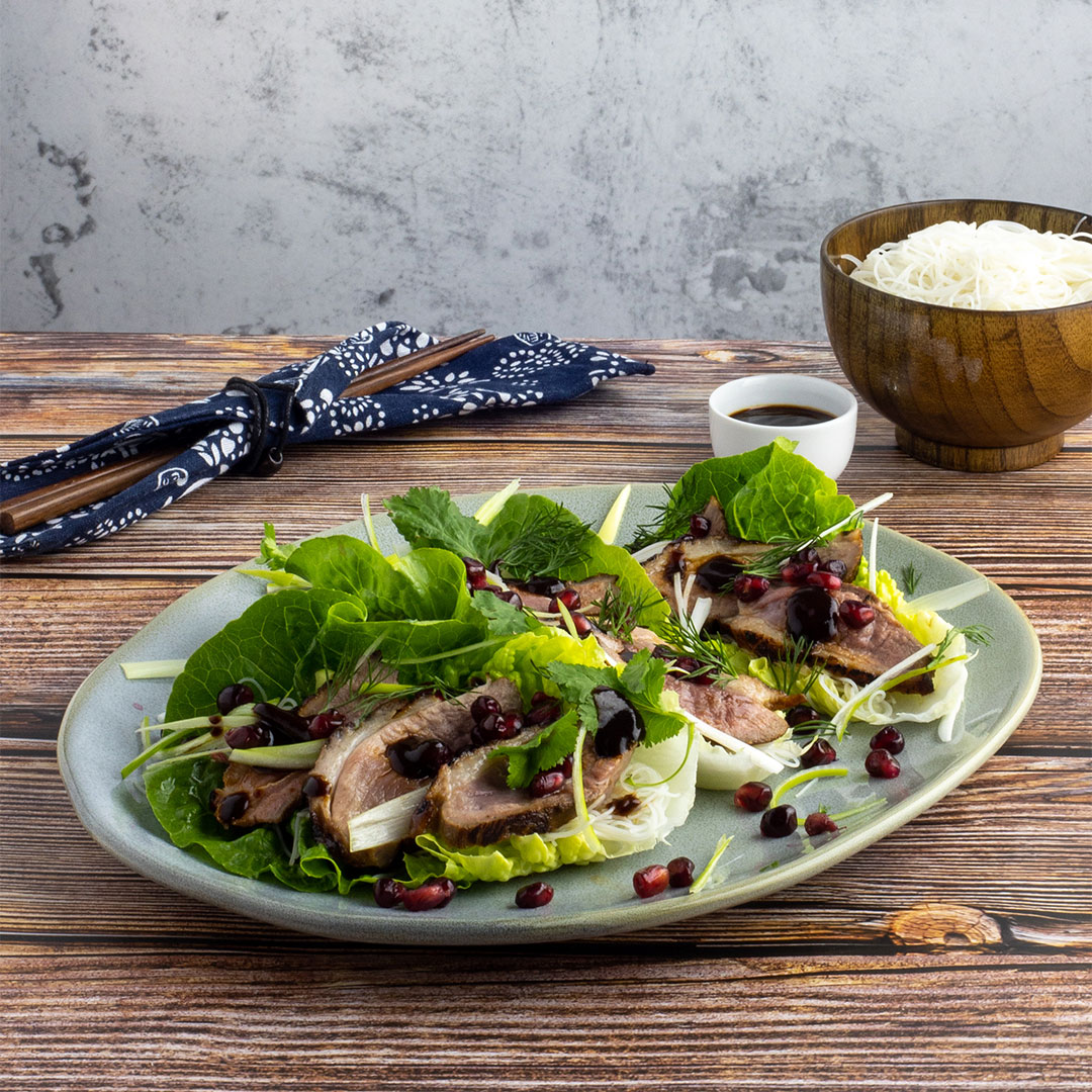 - Na celé listy římského salátu naservírujeme nejprve rýžové nudle a poté plátky kachny, libovolně vše posypeme nakrájenou jarní cibulkou, vyloupanými granátovými jablky, snítky koriandru a čerstvého kopru. Nakonec vše zakápneme hoisin omáčkou.