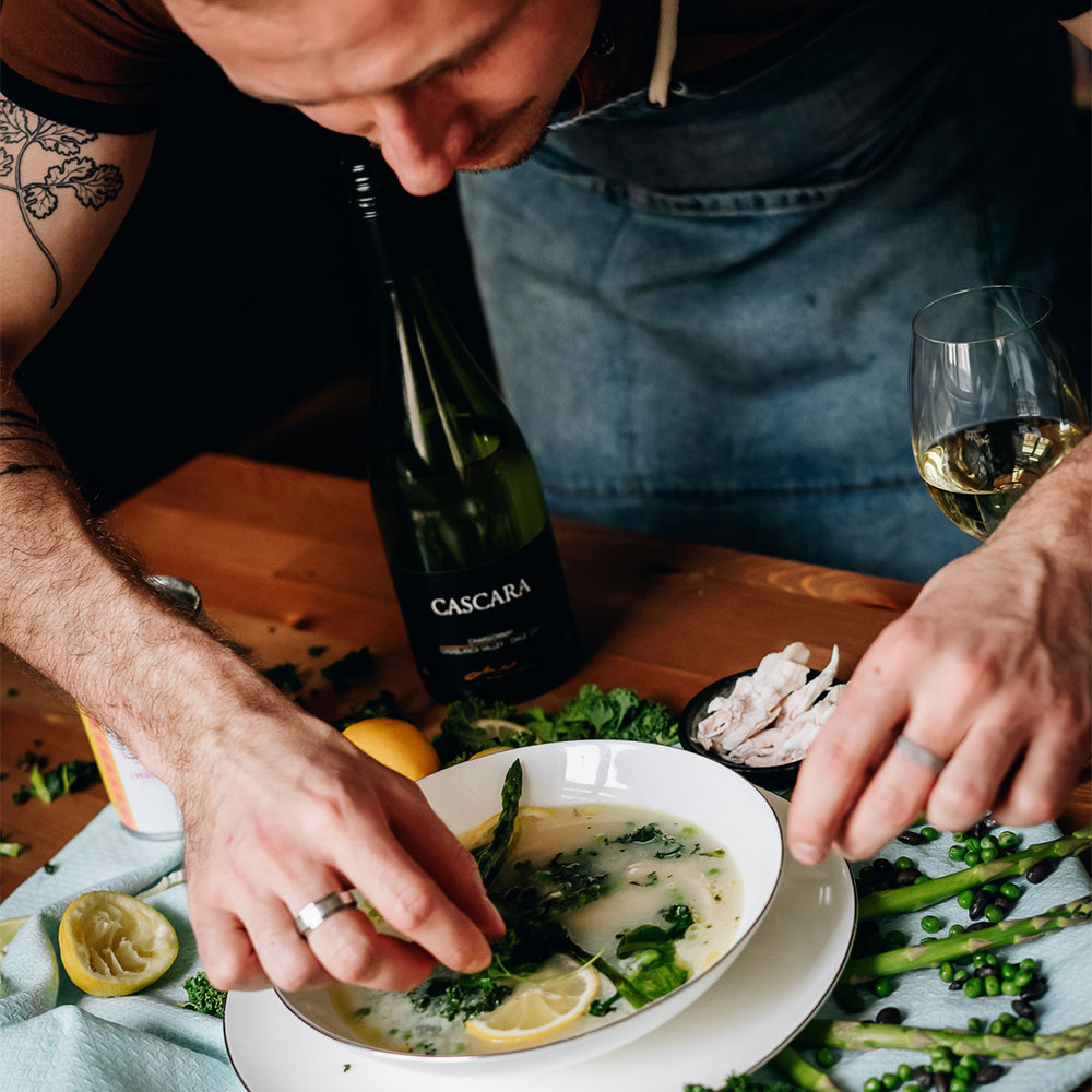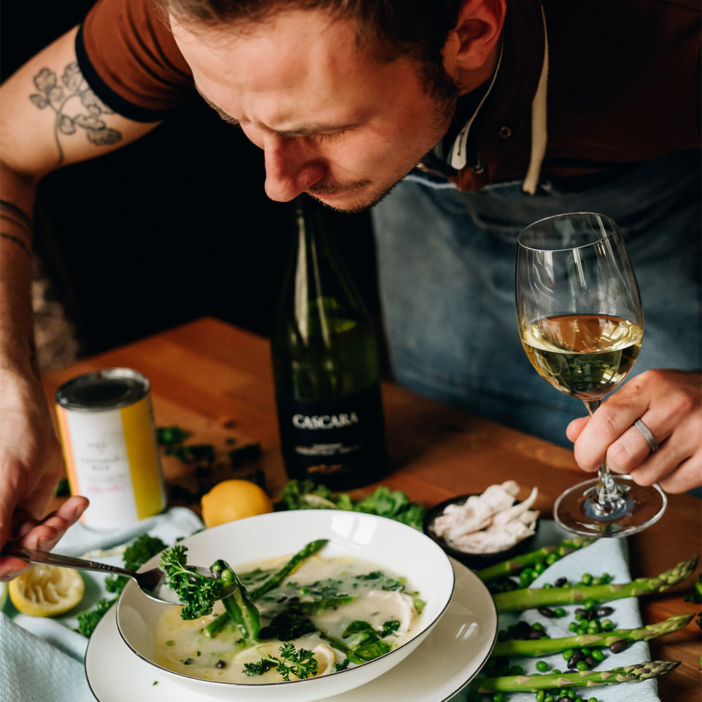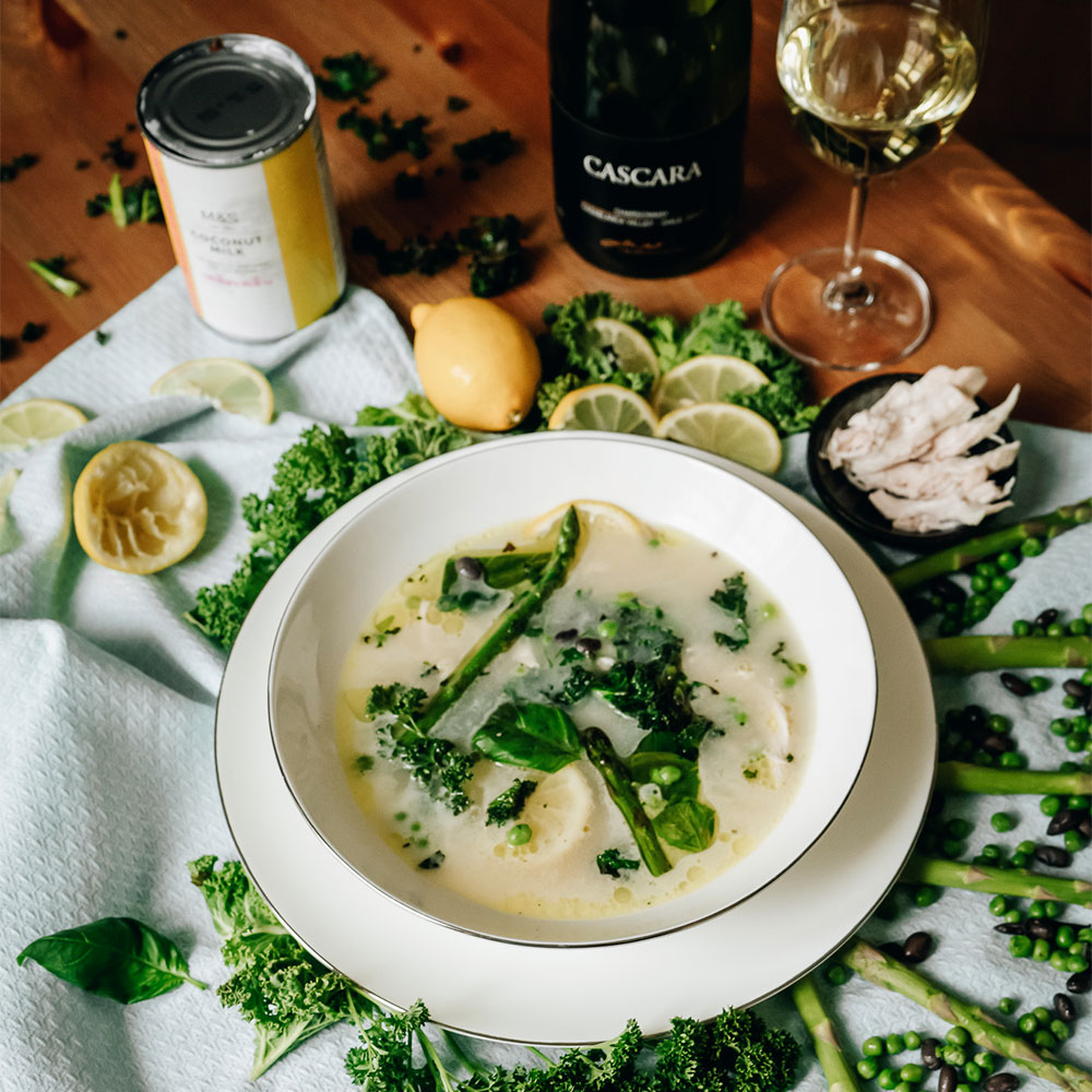Musím říct, že tento recept mě moc překvapil svou lehce kyselou chutí spojenou s vůní bazalky a atypických ingrediencí a křupavé čerstvé zeleniny se silným kuřecím vývarem. Určitě je dobré připravit si velice kvalitní kuřecí vývar den dopředu, aby se řádně uležel, a na druhý den polévku zkompletovat. Polévku velice hezky doplnilo chilské víno Cascara z Casablanky, kde místní pěstují velice elegantní a na chuť bohatou odrůdu Chardonnay. Myslím si, že toto víno a jeho příjemná ananasová dochuť zcela perfektně doplnila chuť citronovo-kokosové polévky s trhaným kuřecím masem. Zkuste ji taky, určitě Vám bude chutnat.