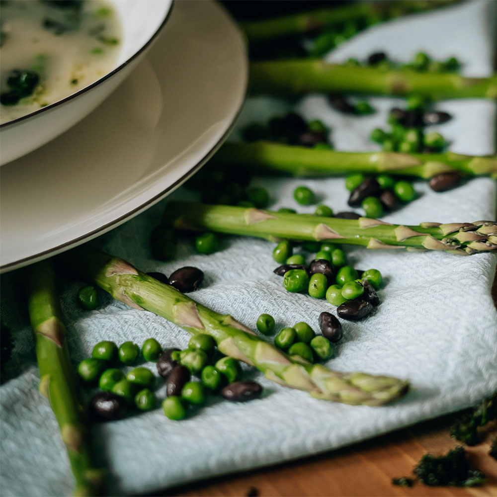 4. Směs zeleného hrášku, fazolí a chřestu opět blanšírujeme v horké vodě a následně zchladíme v ledové vodě.