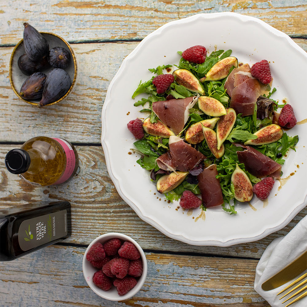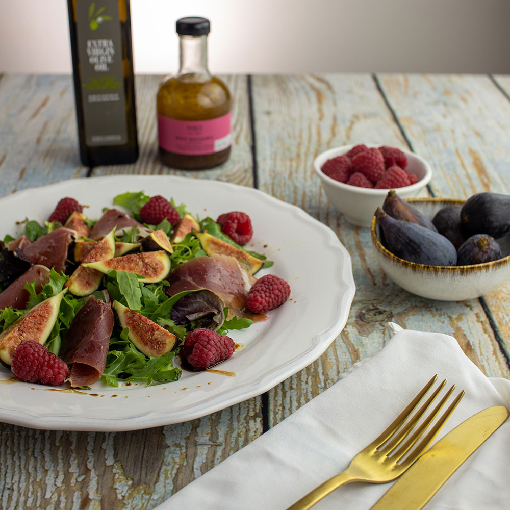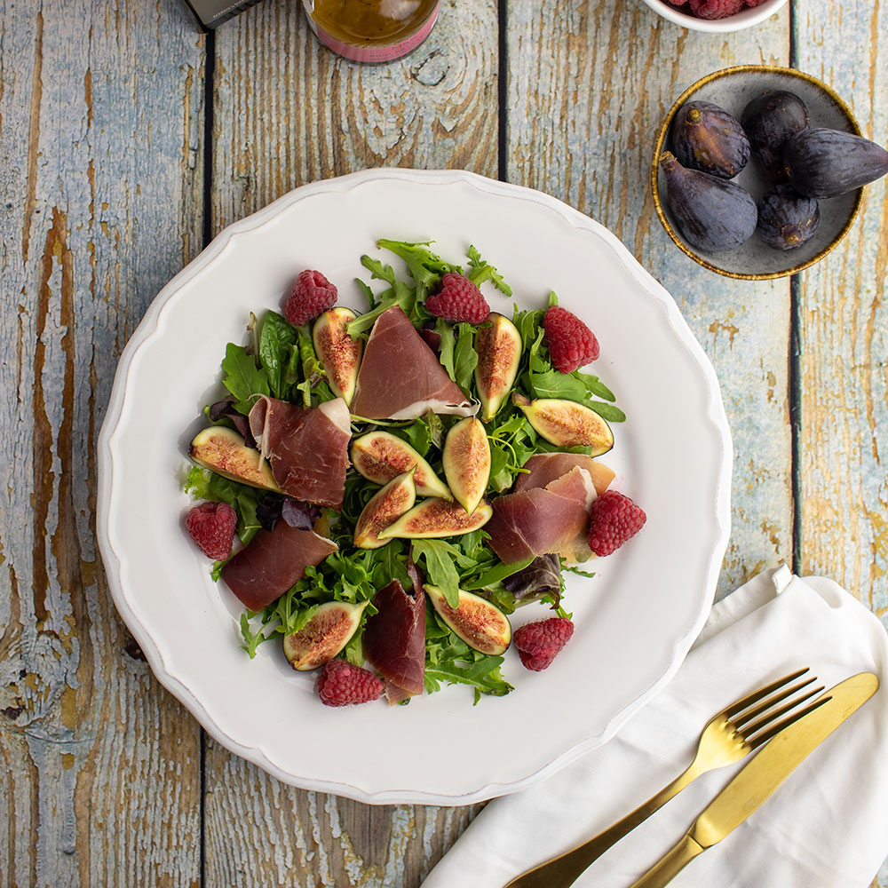 - Očištěné a rozčtvrcené fíky vyskládáme dokola na salát a obklopíme plátky sušené šunky. Není od věci vytáhnout prosciutto o něco dříve z lednice a nechat ho odležet – vynikne tak jeho chuť. Pokud se rozhodnete ke koupi starší sušené šunky, doporučujeme vyzkoušet M&S „Hand cut prosciutto“, která zrála 30 měsíců a byla krájená ručně. Rozdíl v chuti poznáte zaručeně.