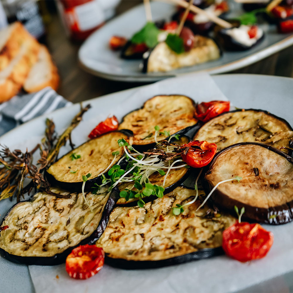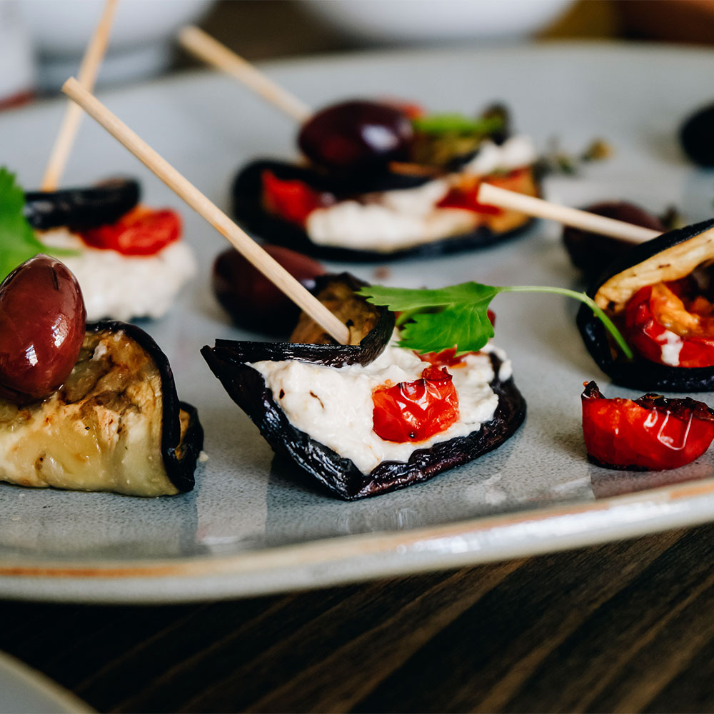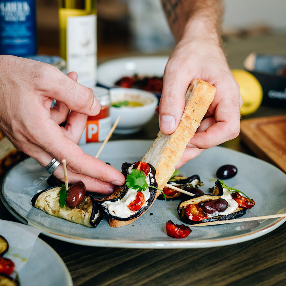 - Grilované lilky můžeme začít plnit libovolným hummusem, pečeným cherry rajčátkem a olivou. Lilek se směsí přehneme, špejlí uděláme tzv. “wrap” a tento celý proces opakujeme, dokud nespotřebujeme všechny suroviny. Ozdobíme čerstvým koriandrem a zakápneme olivovým olejem, citronem a podáváme s čerstvou focacciou, nebo jiným oblíbeným pečivem.