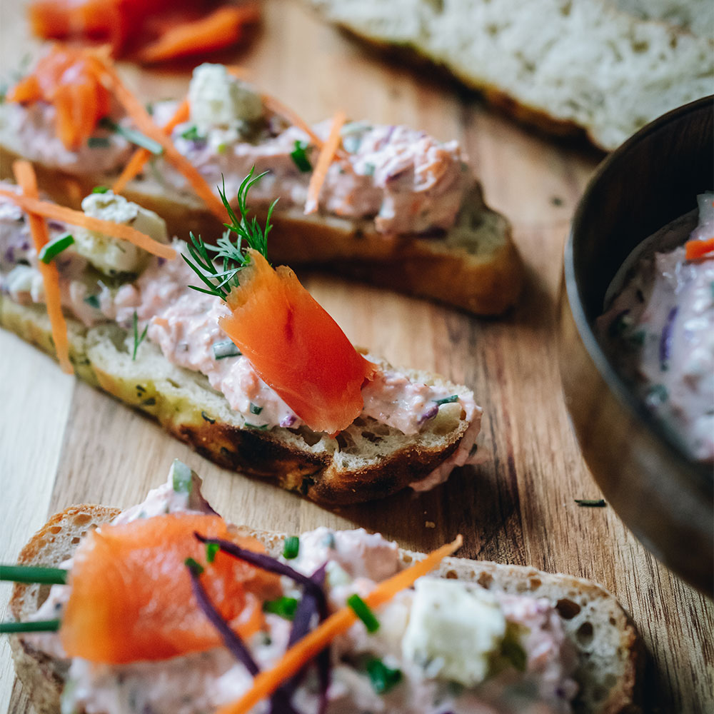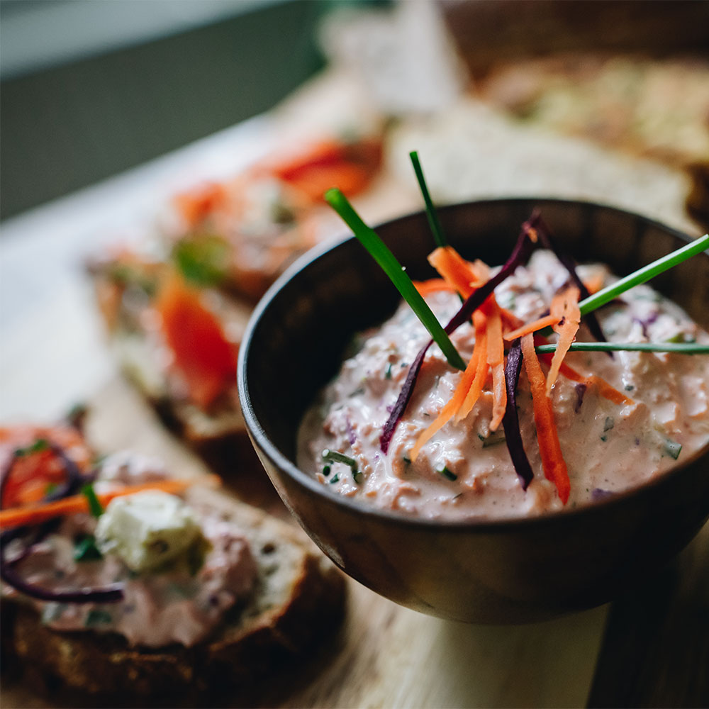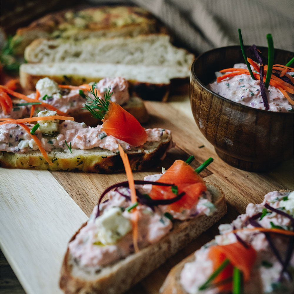 3. Pomazánku servírujeme na Váš oblíbený chléb nebo bagetu, zdobíme plátky uzeného lososa a feta sýrem. Nezapomeňte posypat čerstvou pažitkou a mrkví.