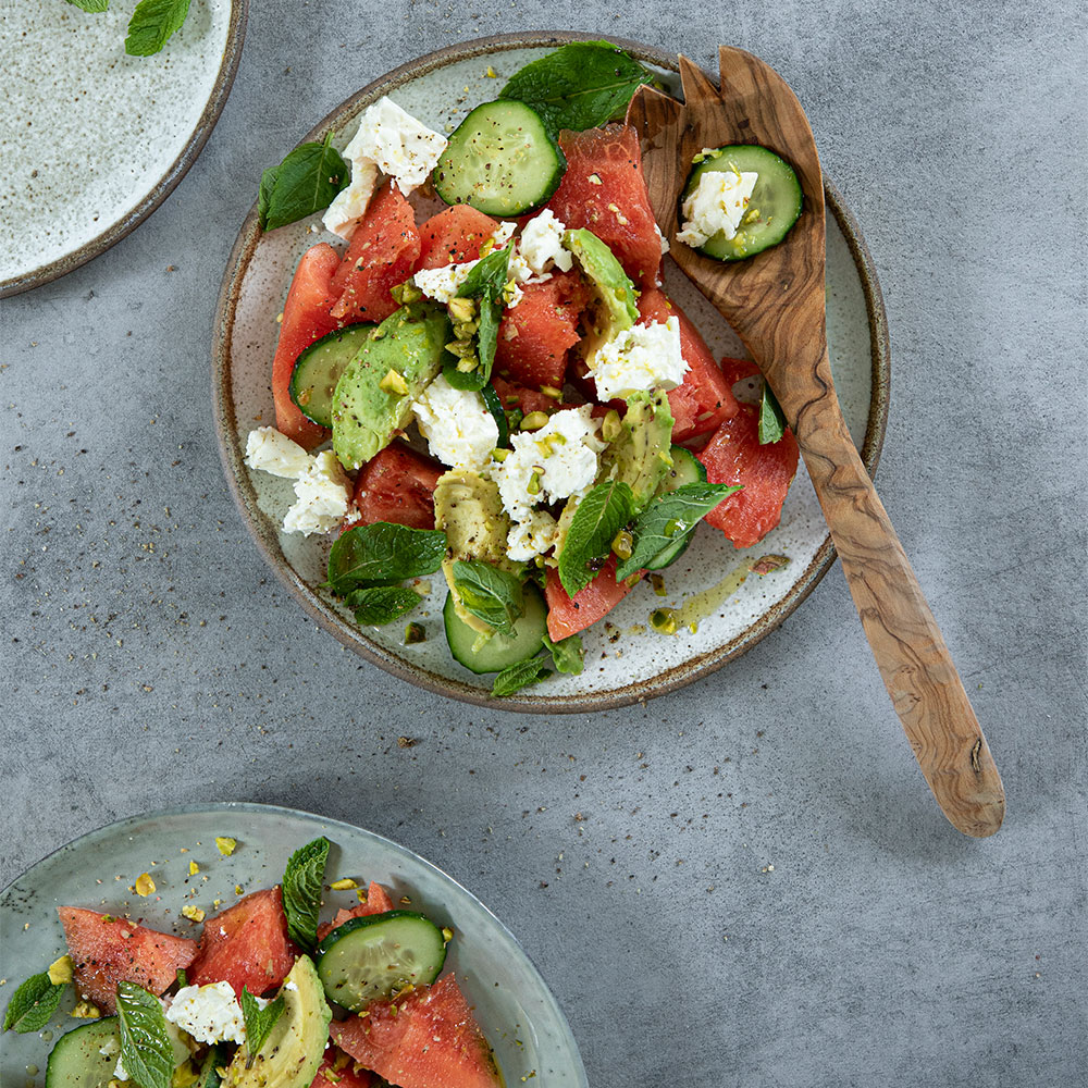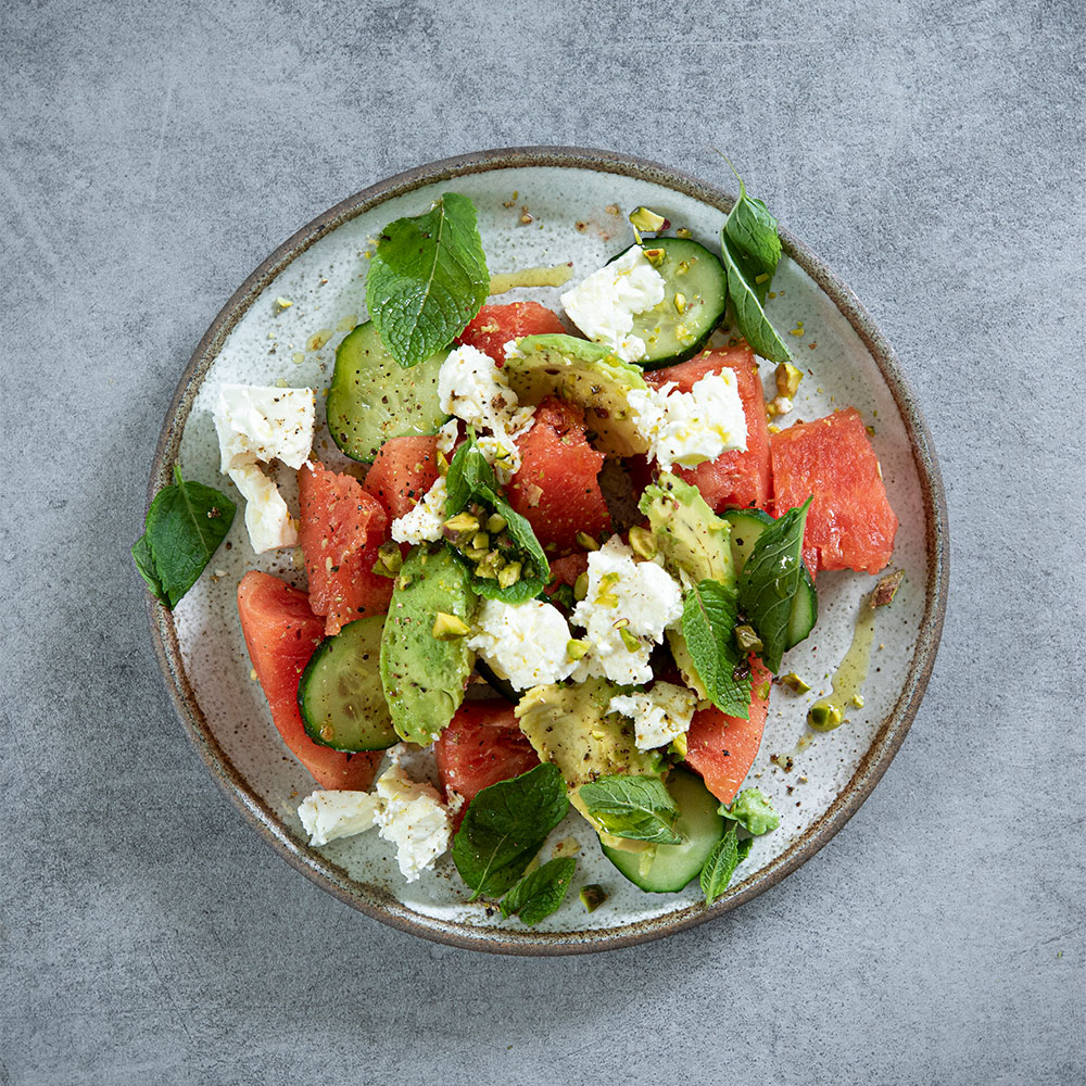 - Meloun omyjte a nakrájejte na větší kousky, lžící vydlabejte kousky avokáda, okurku pokrájejte na kolečka nebo kostky a vše smíchejte ve velké míse spolu s natrhanou mátou.
