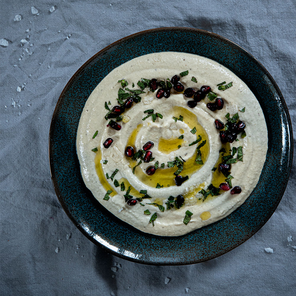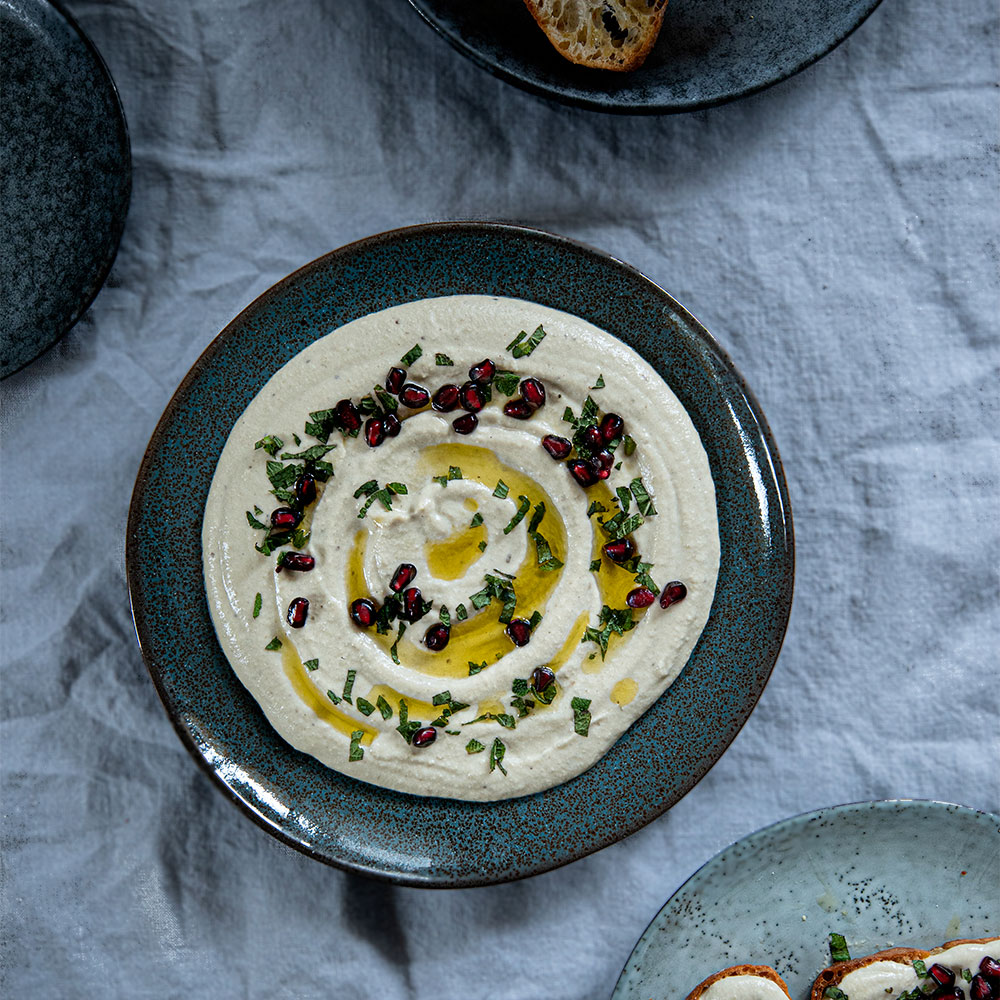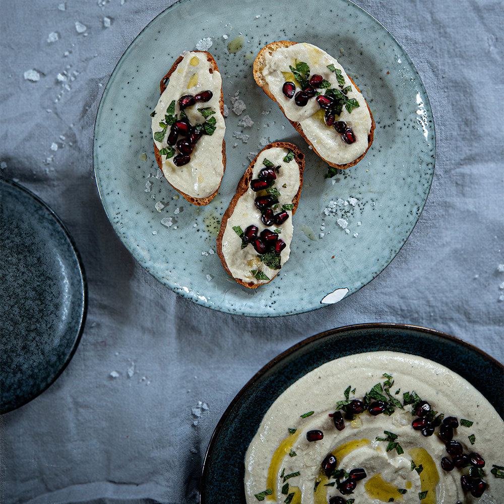 - Pomazánku podávejte na velkém talíři zakapanou olivovým olejem, dozdobenou granátovým jablkem, nasekanými lístky máty a vločkovou solí spolu s opečenými plátky bagety nebo ji na křupavou bruschettu z kváskové bagety rovnou namažte a ozdobte až jednotlivé minichlebíčky.