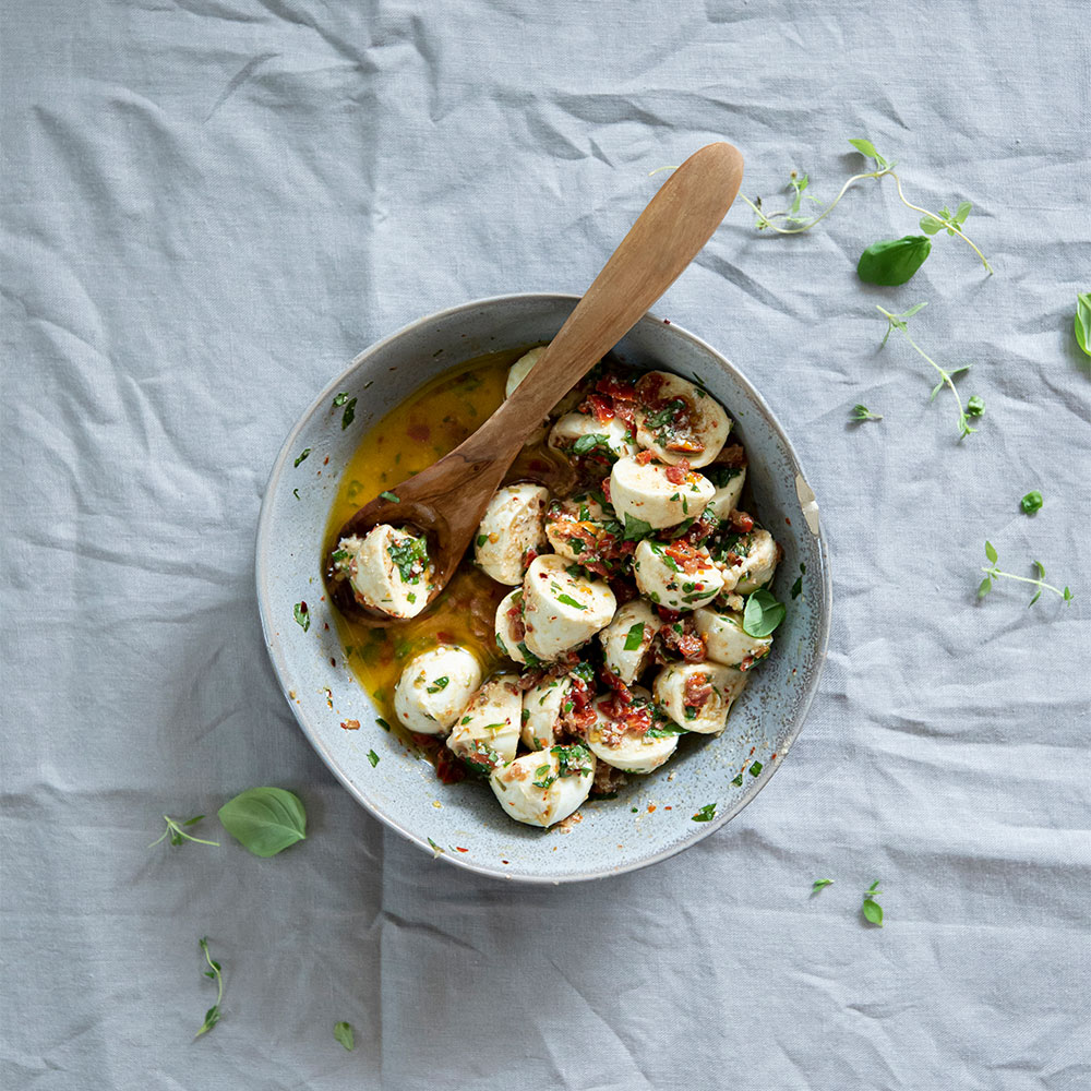 - Začněte tím, že si namarinujete mozzarelu. Ideální je sáhnout po mozzarellových kuličkách, ale můžete vzít větší mozzarellu a natrhat jí na menší kousky.