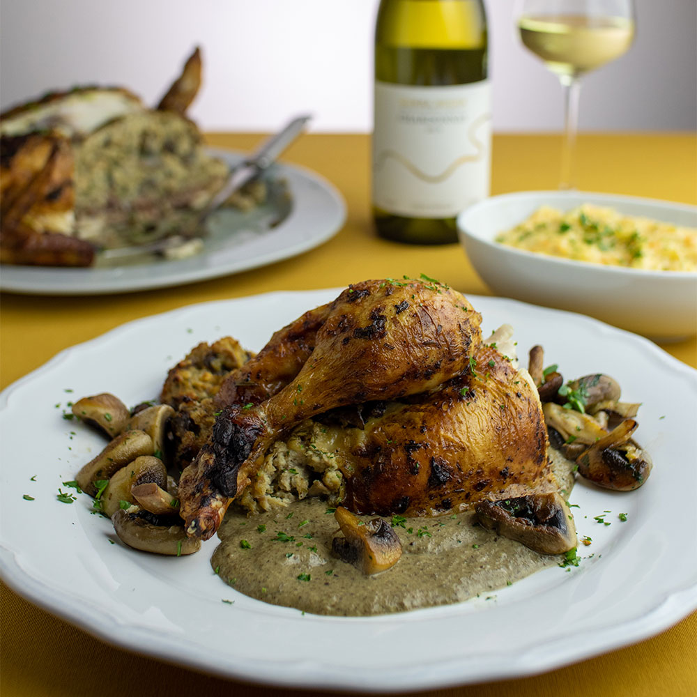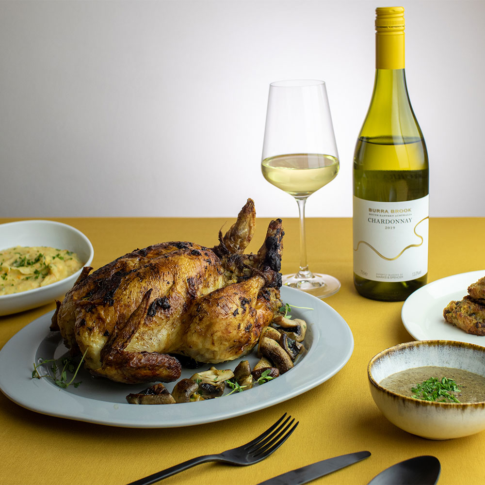 - Wine pairing: Chardonnay, Burra Brook, Austrálie, 2019. Těm z vás, kteří mají rádi víno a zajímají se o wine pairing bych rád k tomuto receptu doporučil australské Chardonnay Burra Brook 2019. Toto stylové a elegantní Chardonnay je vyrobeno z prémiových hroznů z teplých a chladných vinařských oblastí z různých částí Austrálie. V chuti převládá kombinace vyzrálých tropických tónů s osvěžující kyselinkou a zjemňující nádech dubu, který je výsledkem krátkého zrání v dubových sudech, ale který zároveň nijak nezastiňuje příjemně citrusovou chuť. Chardonnay Burra Brook se tak výborně hodí ke kuřecímu masu a skvěle doplňuje i šťavnatou houbovou nádivku a omáčku. Podávejte lehce chlazené. Kromě skvělé chuti určitě potěší i cenová dostupnost tohoto nevšedního vína z daleké Austrálie.