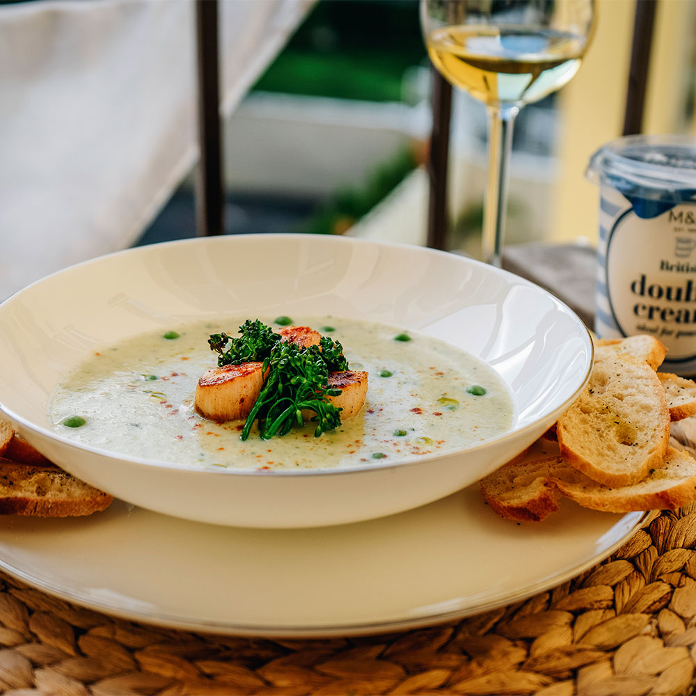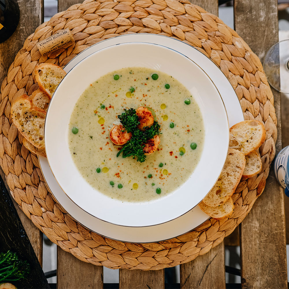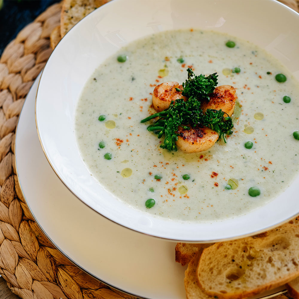 6. Pokud máme vše připravené a ochutnané, tak do středně hlubokého talíře naservírujeme krémovou “zelenou” polévku. Doprostřed položíme restované mušle sv. Jakuba, ozdobíme křupavou restovanou brokolicí a pohodíme kolem hrášek. Zakápneme olivovým olejem a kolem dokola lehce posypeme kajenským pepřem.