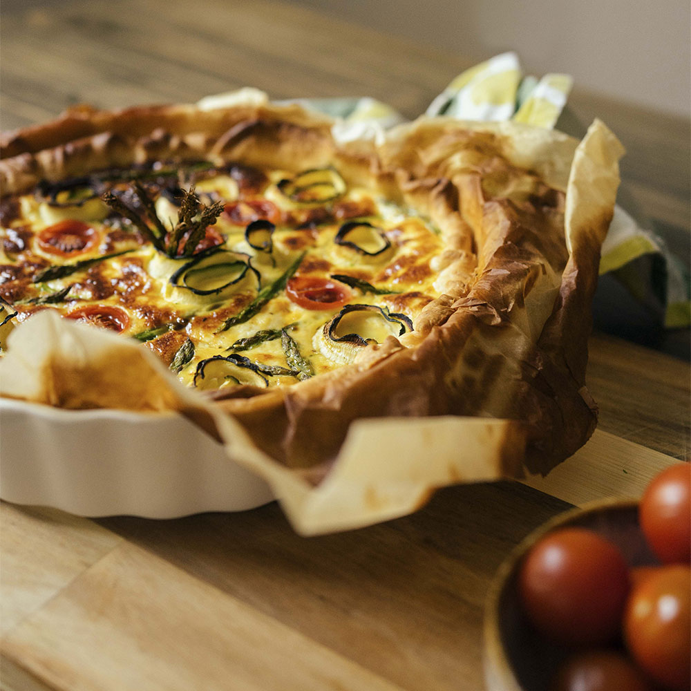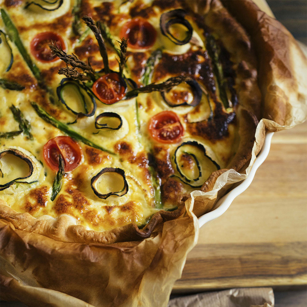 - Do formy nalijte směs ricotty a vajíček, poté libovolně poklaďte nasekanou cuketou a chřestem. Plátky nebo roličky? Jak si vyhrajete s krájením zeleniny, nechám zcela na vás. Každopádně fantazii se zde meze nekladou. Na závěr celé dílko ozdobte ještě rozpůlenými cherry rajčátky pro pestrost barev i chutí.