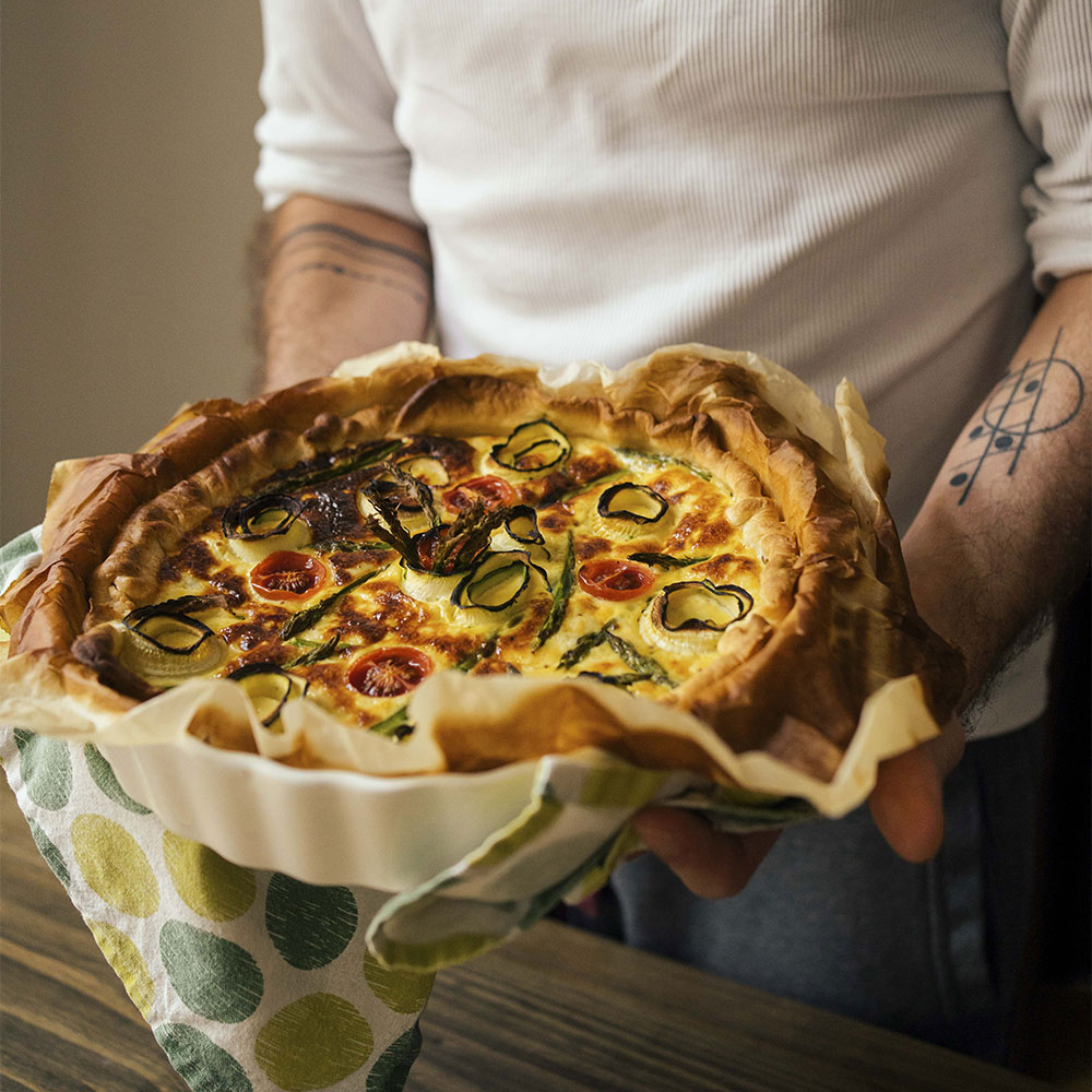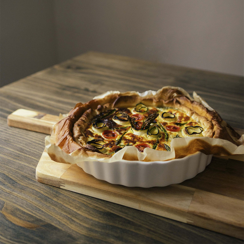 - Předehřejte si troubu na 180 °C. Do kulaté keramické formy vložte listové těsto a vytvarujeme ho úhledně do boků a požadovaného tvaru.