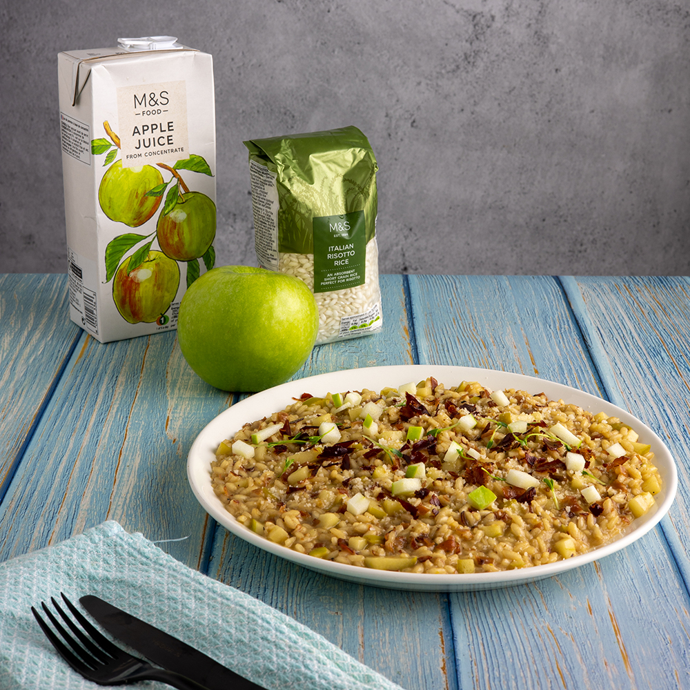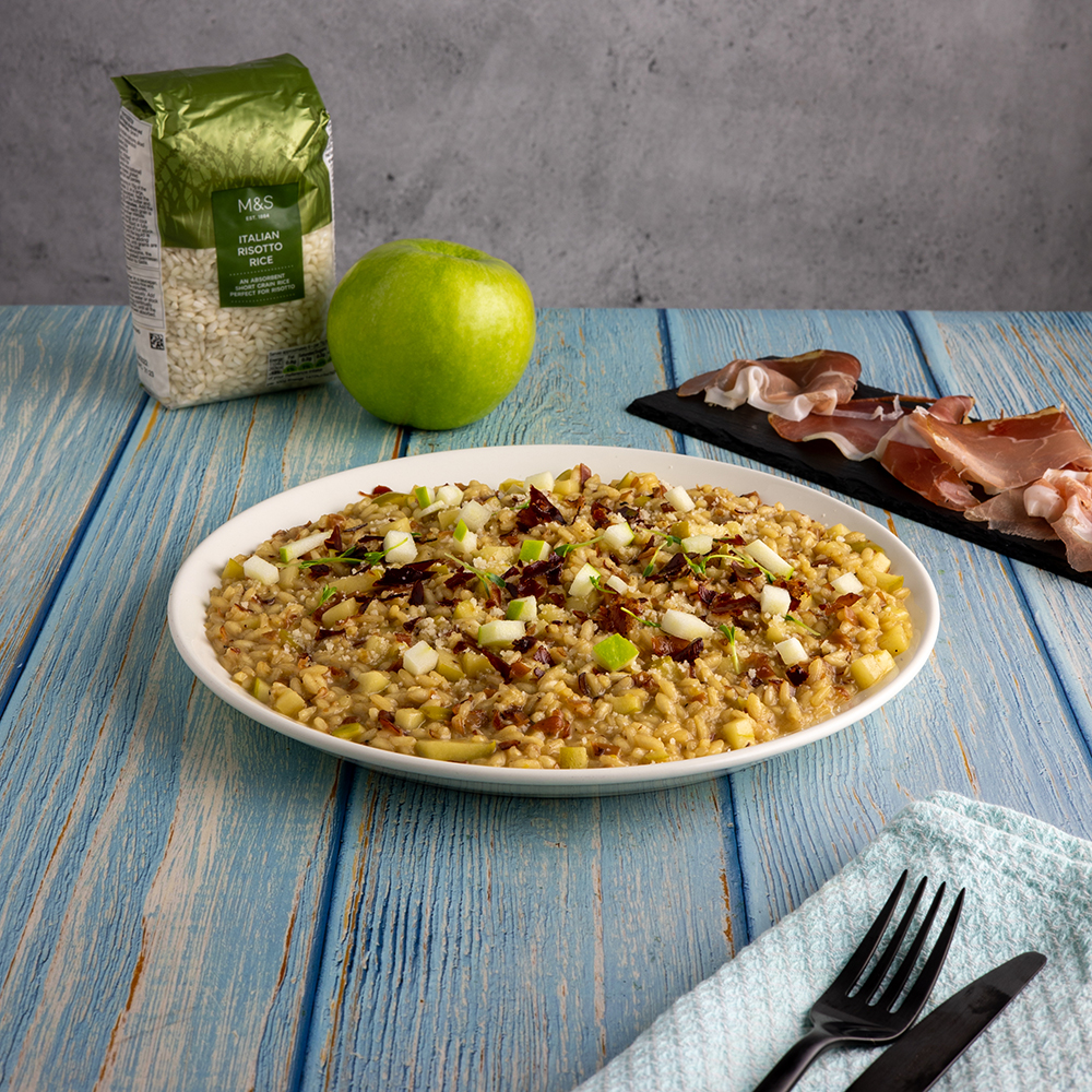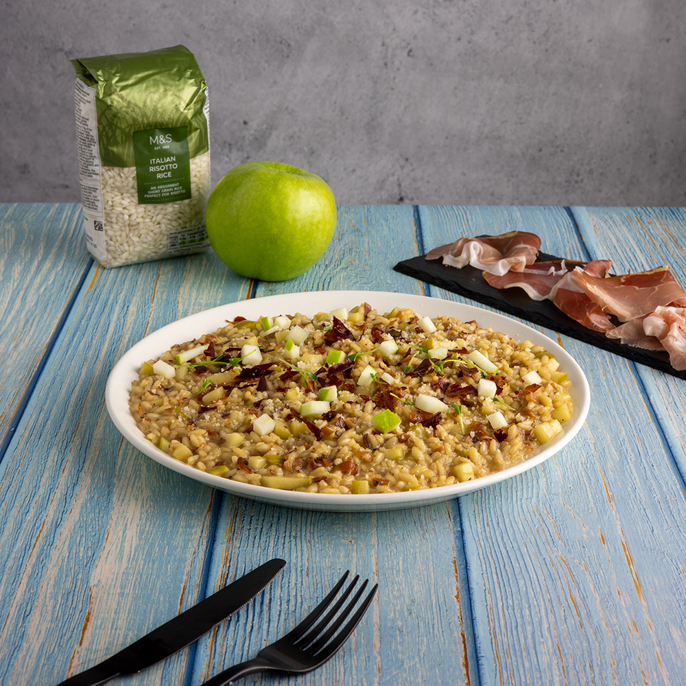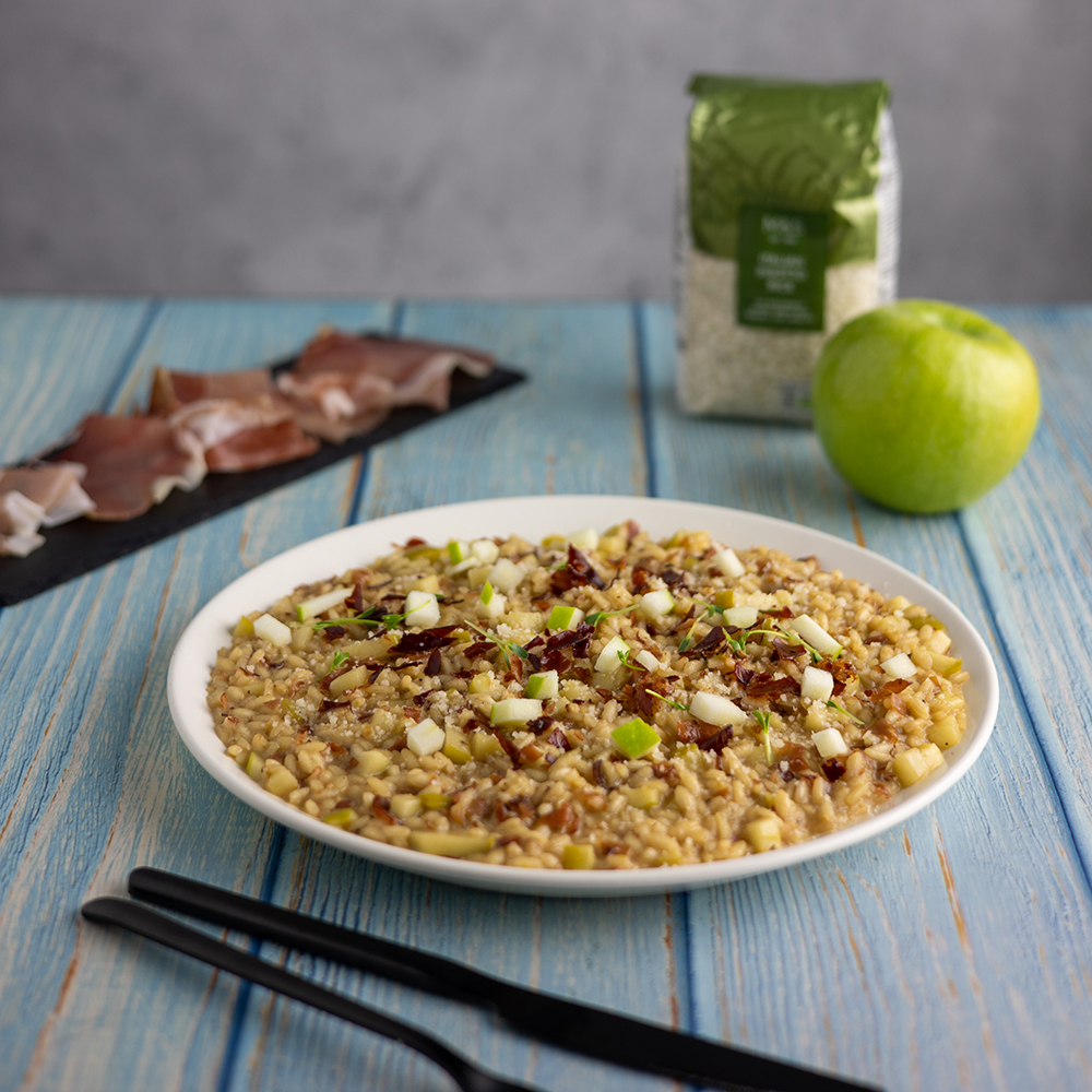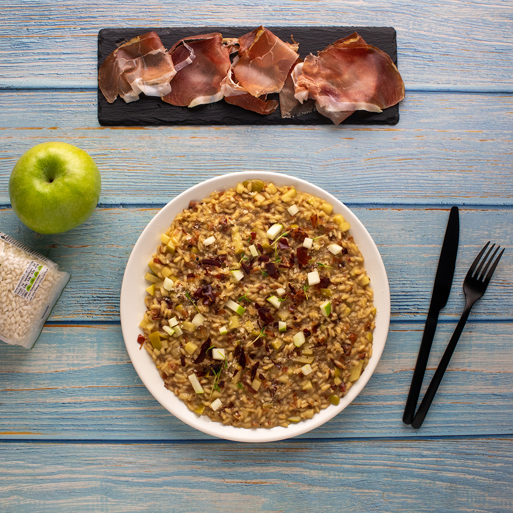 - írujeme na velkém talíři, rizoto by mělo být krémové a lahodné. Nahoru přidáme vypražený speck a pokud chcete být úplně profíci můžete vše ozdobit i par kostičkami příjemně kyselého jablka Granny Smith.