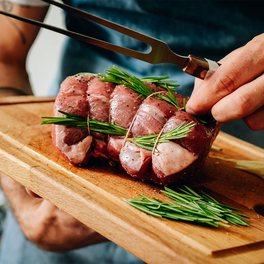 1. Maso si nejdříve očistíme a zbavíme jej tuhé svrchní blány. Poté je ze všech stran opepříme a osolíme a potřeme dijonskou hořčicí. Směs soli, pepře a dijonské hořčice opravdu důkladně vmasírujeme do masa. Pomocí potravinářského provázku maso svážeme a zpevníme jeho celek na pravidelný váleček. Při vázání masa můžeme ze všech stran přidat snítky čertsvého tymiánu. V posledním kroku maso potřeme lanýžovým olejem nebo olivovým olejem. Maso zabalíme do potravinářské folie a necháme marinovat, tady platí čím déle tím lépe, hraje zde role výsledná chuť. Klidně můžeme marinovat i dva dny.