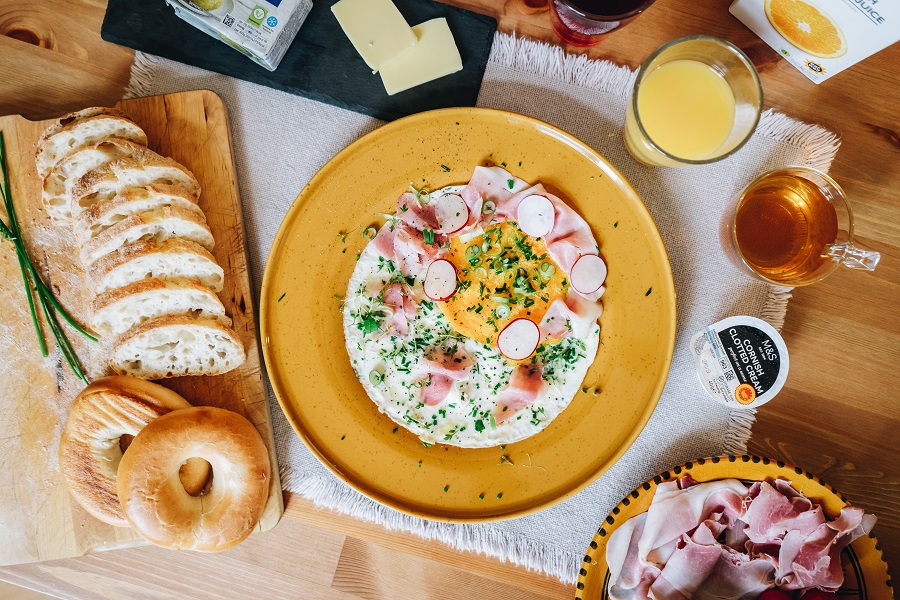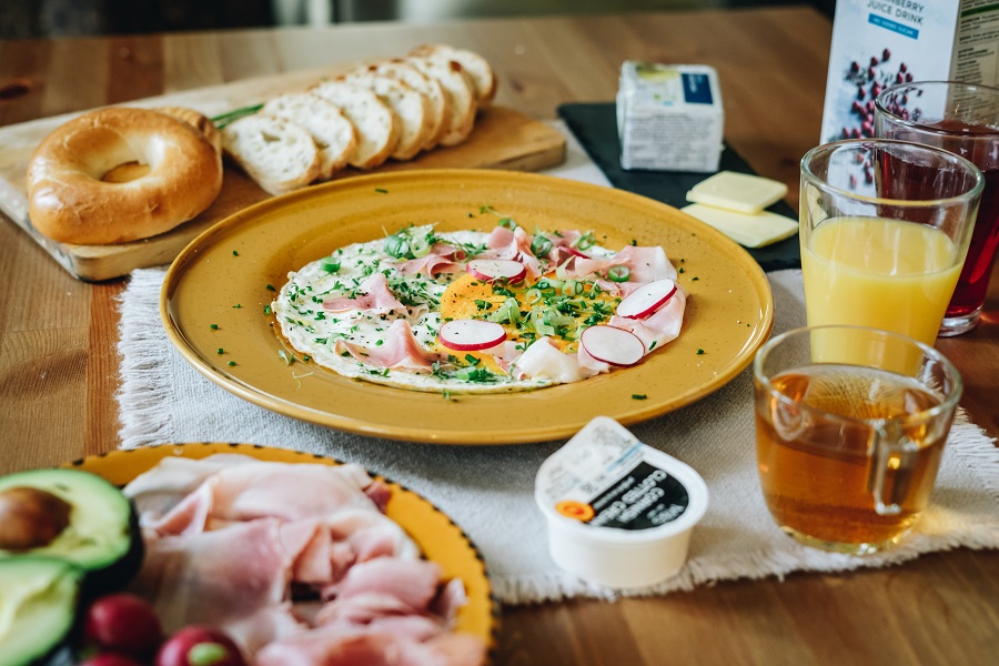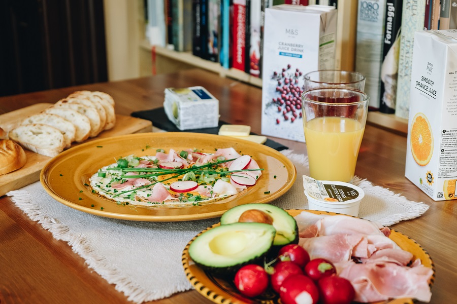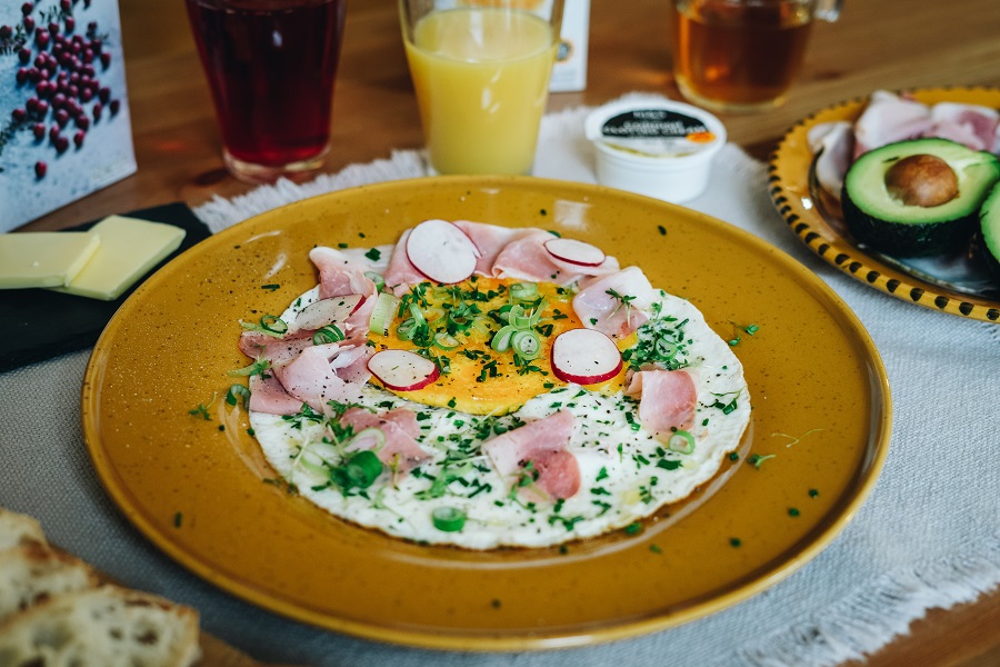 - Poté servírujeme na větší mělký talíř, kde ozdobíme omeletu dušenou šunkou, zbylými bylinkami a plátky ředkviček. K tomu podáváme čerstvé pečivo dle Vaší libosti, nebo jen zeleninu.