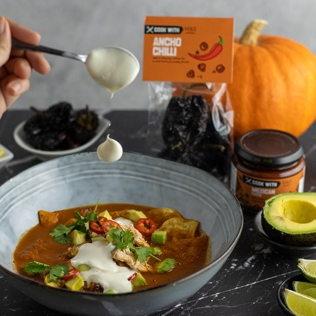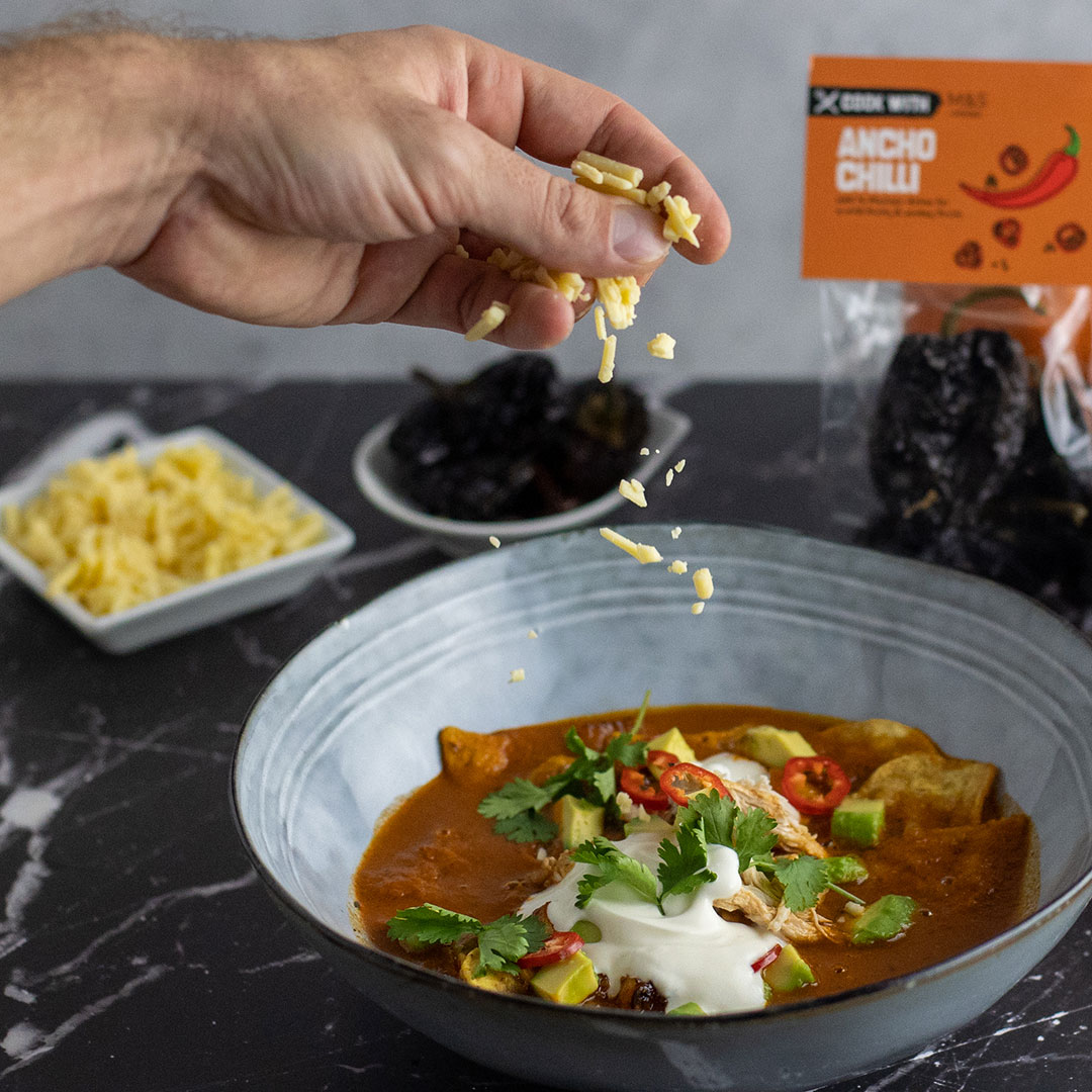 - Ve vroucí vodě nechte provařit Ancho Chilli. Jelikož je sušené, je potřeba aby získalo potřebnou strukturu a rozvinulo svou chuť. Mělo by stačit 10 minut. Mezitím si najemno nakrájejte cibuli a česnek a osmahněte je v kastrolu na trošce oleje dozlatova. Až se krásně zbarví, přidejte pastu Mexican Paste M&S, rajčata z konzervy a několik minut vařte na prudkém ohni. Zatímco se vaří základ na polévku, odstraňte z namočených chilli papriček stopku a semínka, nakrájejte je na plátky a ty přidejte do kastrolu spolu s kuřecími prsy a vývarem. Oheň stáhněte a nechte polévku bublat zhruba půl hodiny.