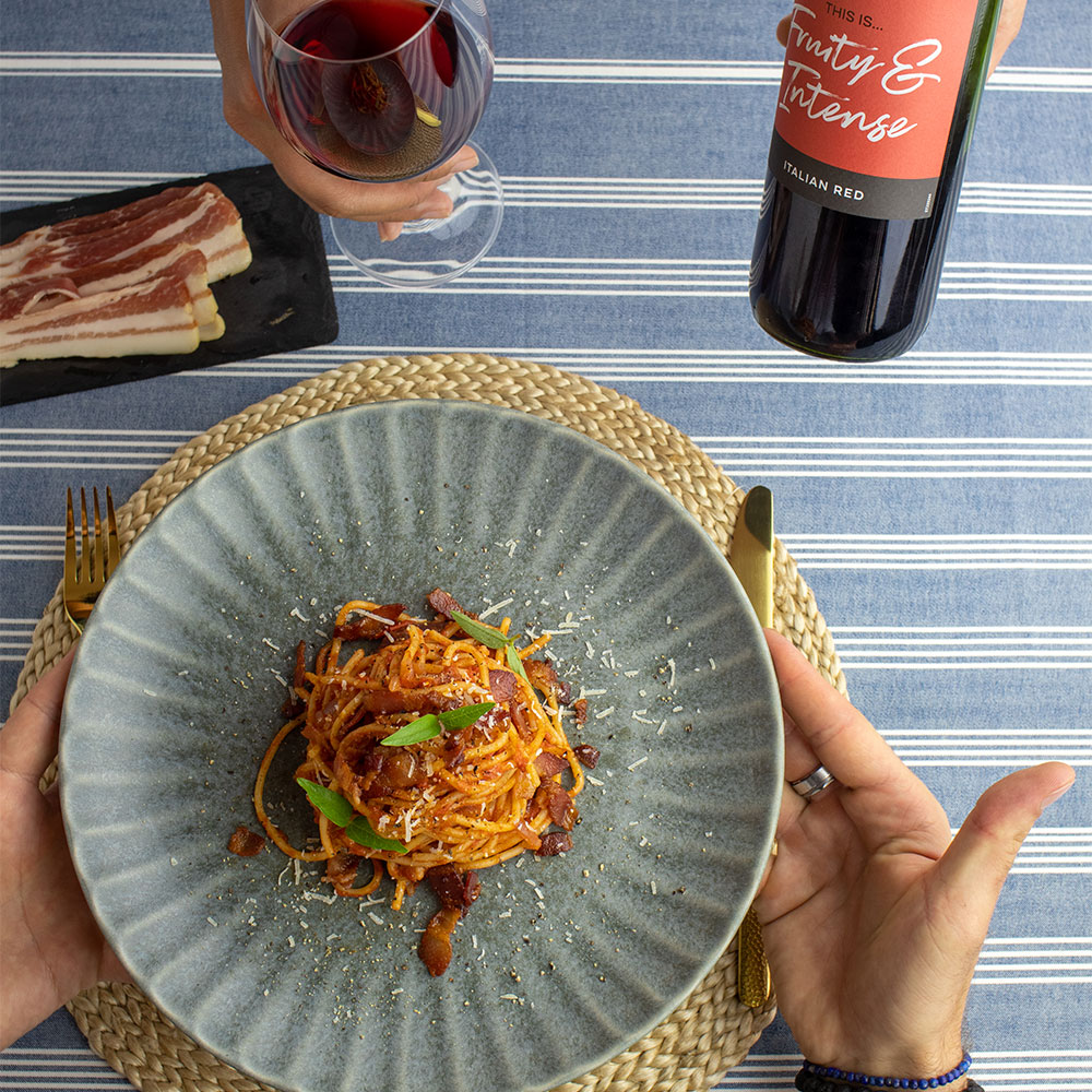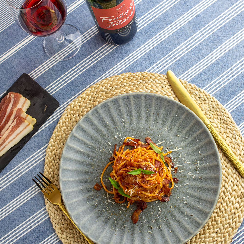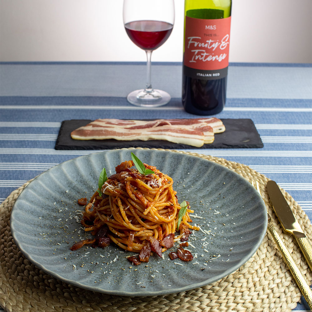 - Wine pairing: M&S This is..., Italian Red 2019. K masové omáčce se skvěle hodí víno z řady M&S This is... s výstižným názvem Italian Red. Je vyrobeno z lokálních červených hroznů a vyznačuje se lehkým tělem, ale přitom příjemně intenzivní chutí, která vám bude připomínat lesní ovoce. Italian Red je příjemně pitelné a nebudete kvůli němu muset rozbíjet kasičku.