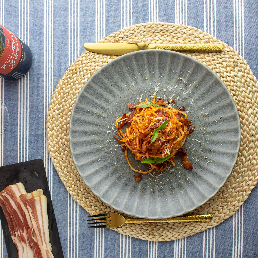 - Spaghetti all’amatriciana podáváme posypané Pecorinem Romanem, plátky křupavé pancetty, čerstvě mletým pepřem a pár kapkami olivového oleje.