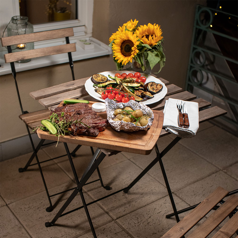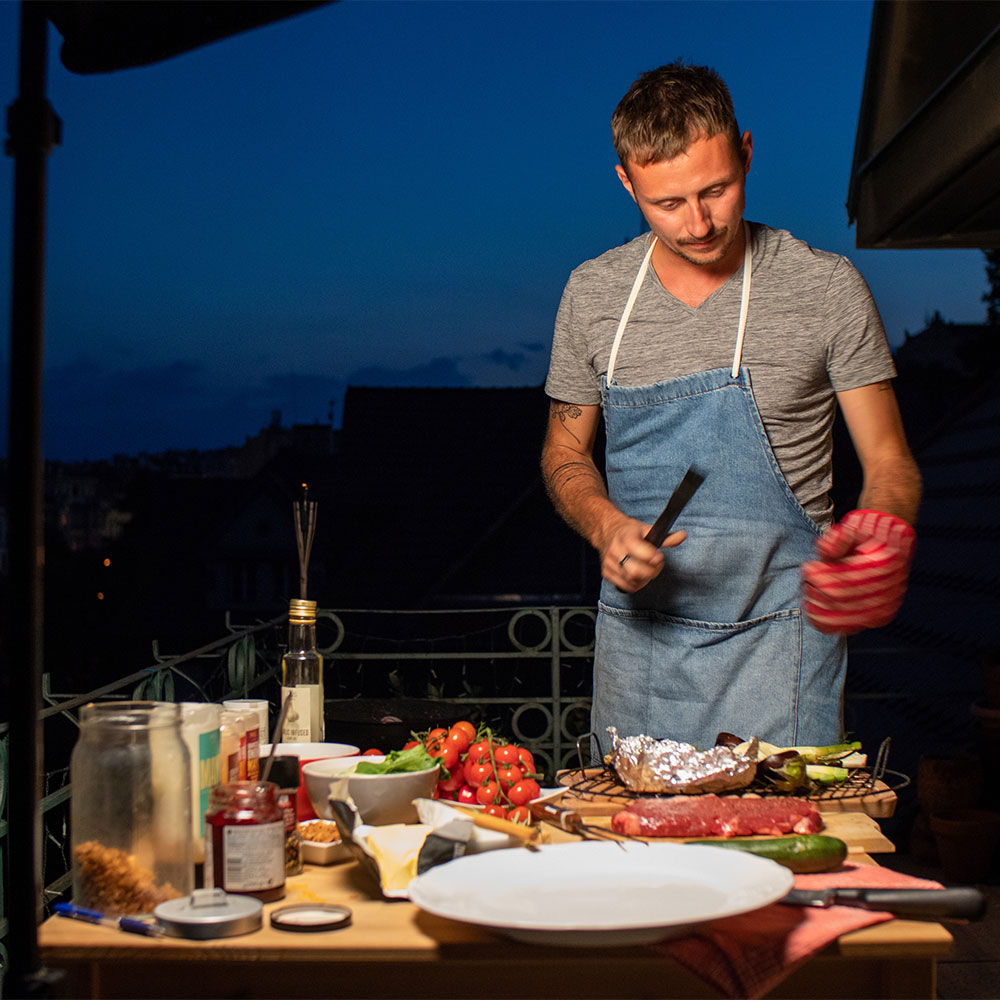- Jakmile dosáhneme požadovaného stupně propečení masa, tak jej sundáme z grilu a necháme odpočinout. Zeleninu můžeme dopékat v uzavřeném grilu.