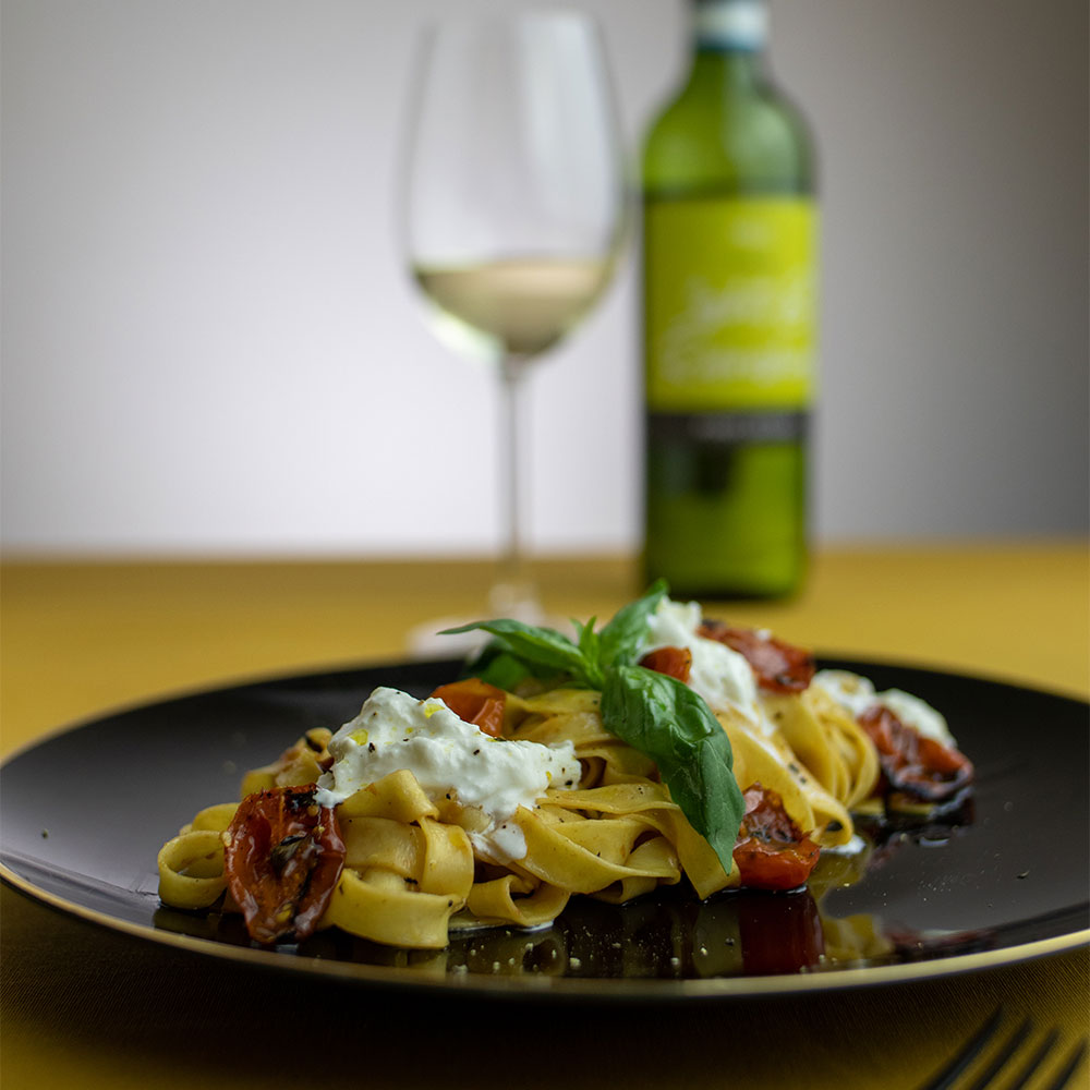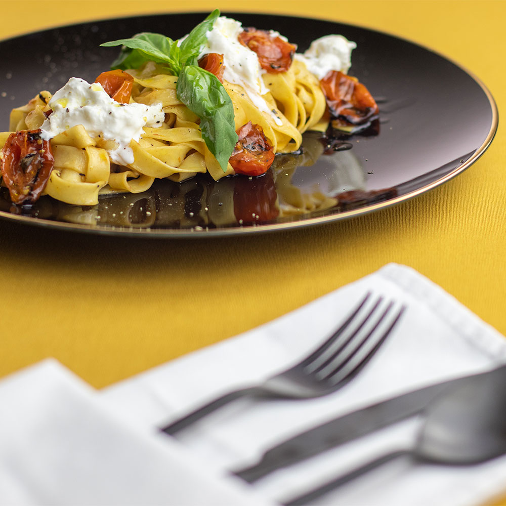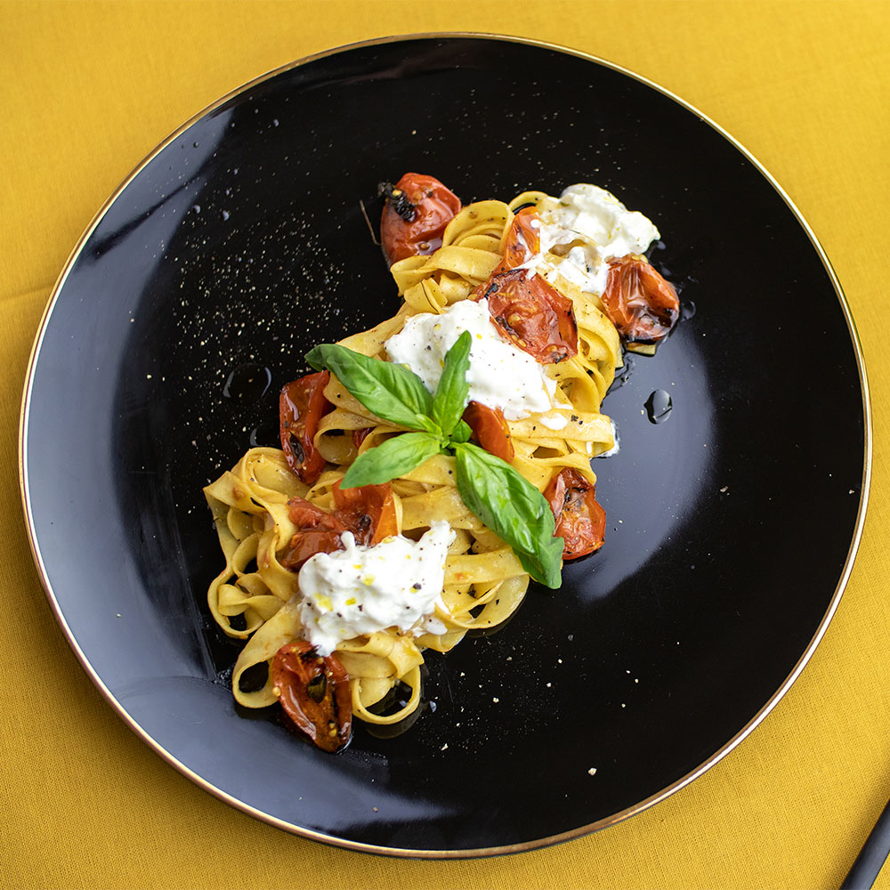 - Na talíř nejprve naservírujeme tagliatelle, volně obložíme zbytkem konfitovaných marinovaných rajčat, navrch natrháme čerstvou burratu a ozdobíme voňavou bazalkou. Burratu doporučujeme před servírováním chvíli ponechat v pokojové teplotě, mnohem více tak vynikne její chuť.