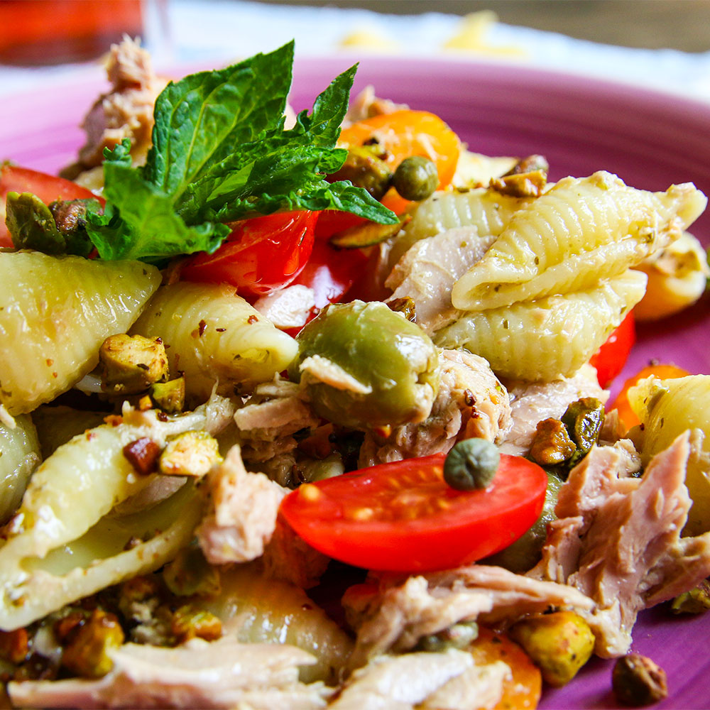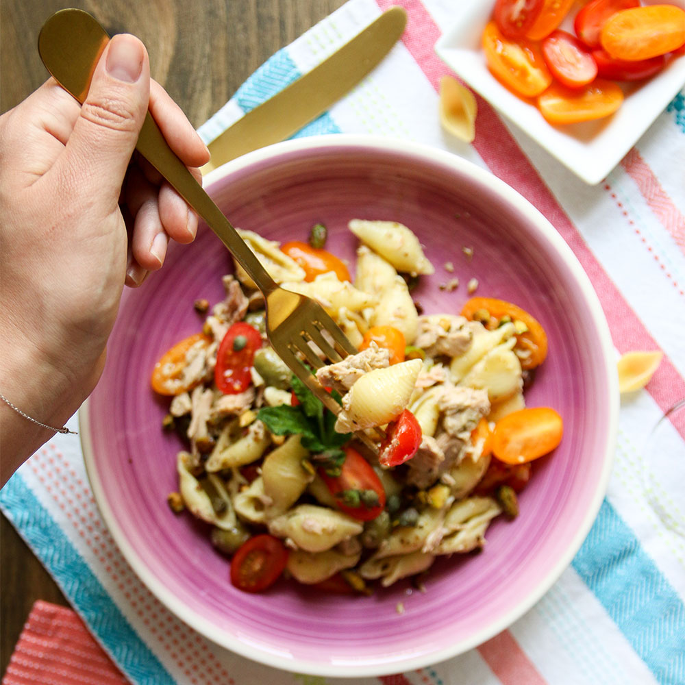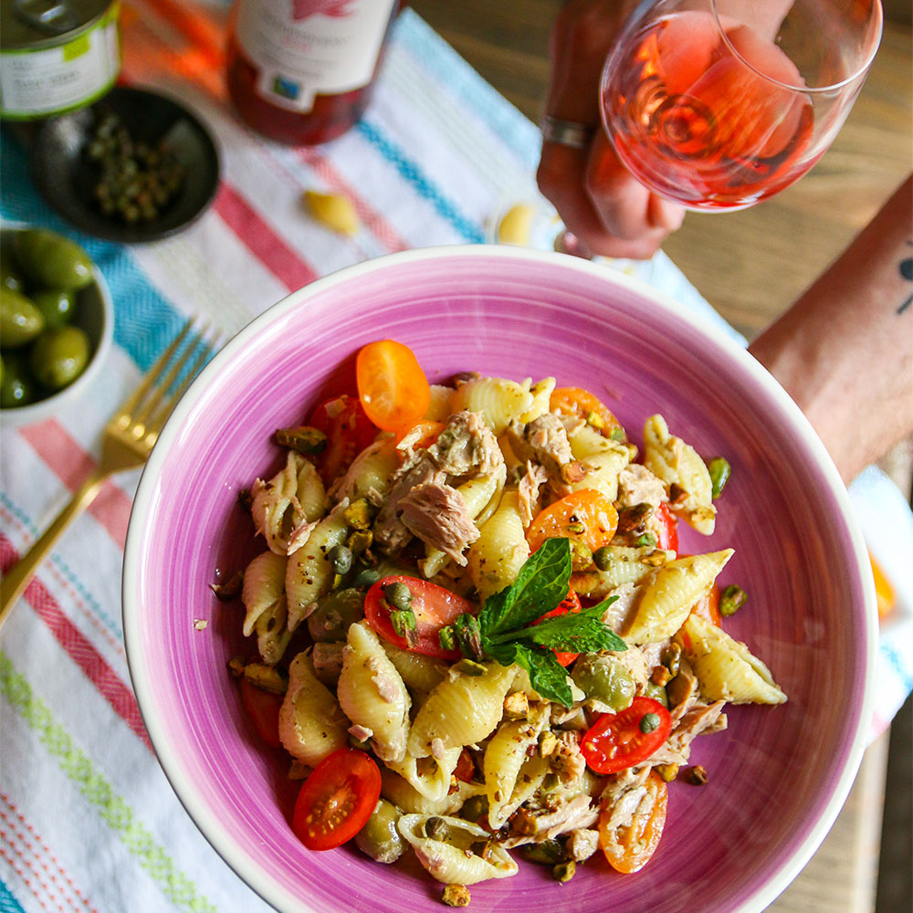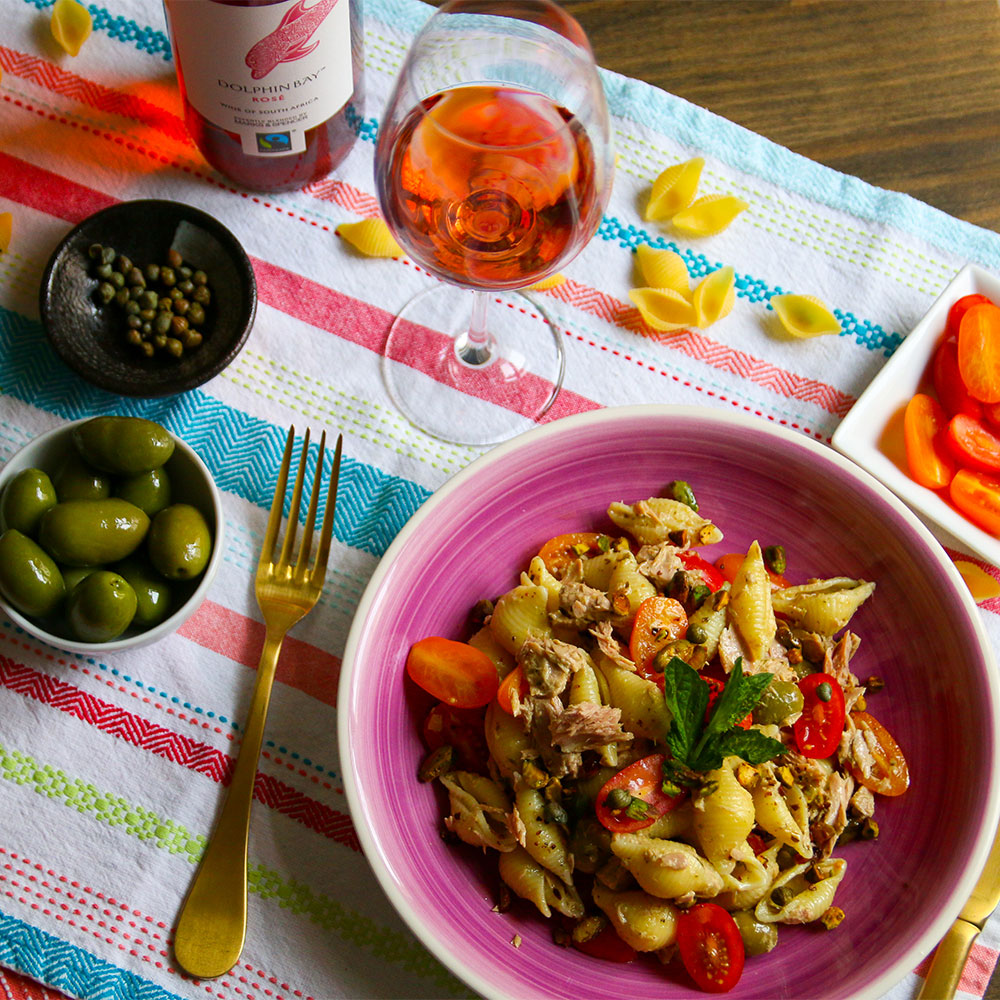 - Jakmile bude těstovinový salát řádně odležen, servírujeme. Pokud byste rádi tento recept ještě o malinko vylepšili, doporučuji ho posypat praženými vyloupanými pistáciemi. A když si navíc za příznivou cenu v M&S přikoupíte růžové víno Dolphin Rosé z jižní Afriky, užijete si skutečné letní snoubení. Toto víno vám svou jemnou lehkostí tento lahodný recept krásně doladí.