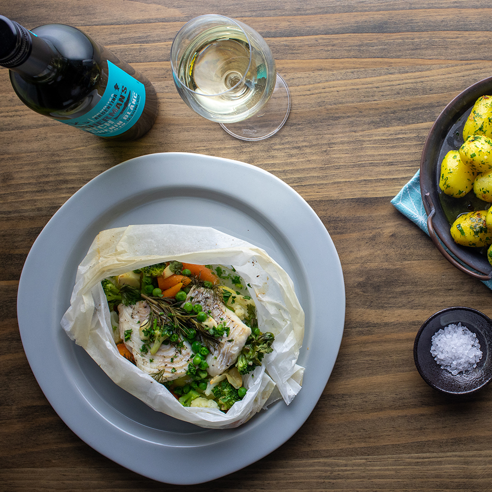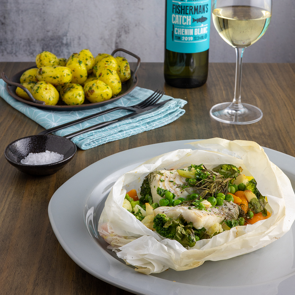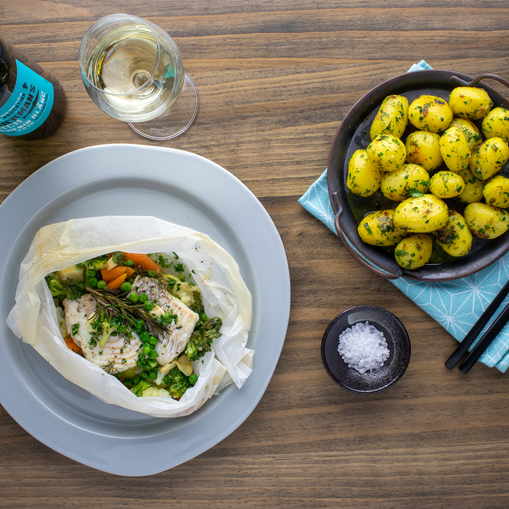 5. Po upečení vytáhneme z trouby, balíček otevřeme a podáváme s bylinkovými bramborami. Nezapomeneme vše zakápnout extra virgin olivovým olejem a citronem. K lehkému pokrmu se bude skvěle hodit lehké bílé suché víno Chenin Blanc z argentinského regionu Mendoza „Fisherman’s catch“.